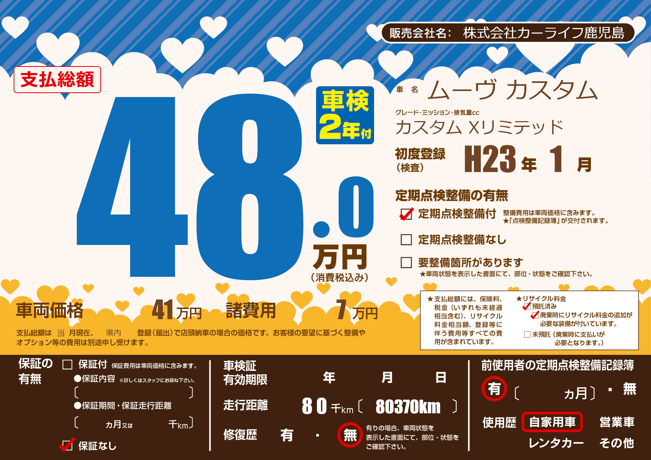 | 走行キロ | 0.8万km | 初年度登録 | H23年1月 |