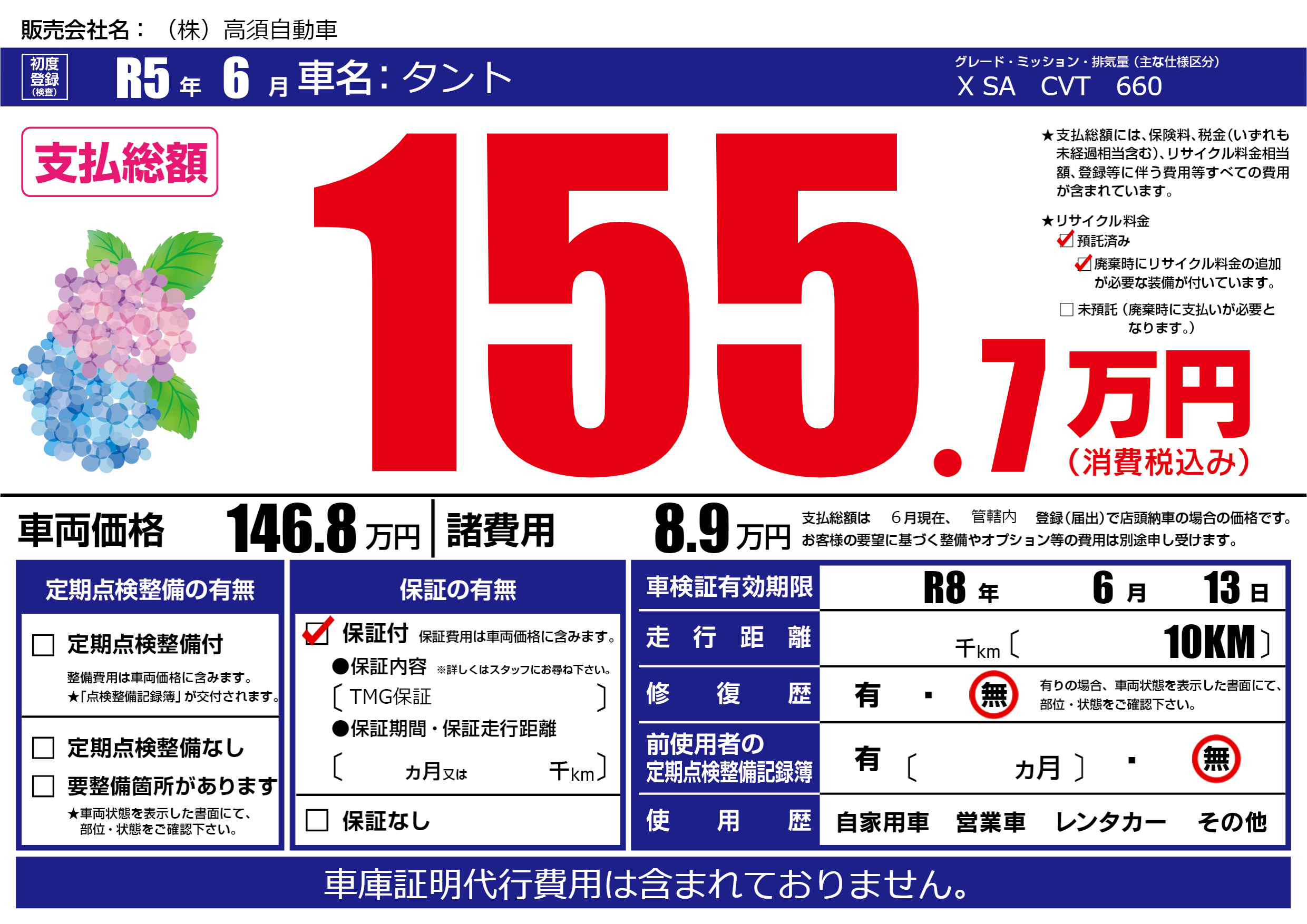 保証付き 保証内容(TMG保証) ---ヶ月または()千kmまで |