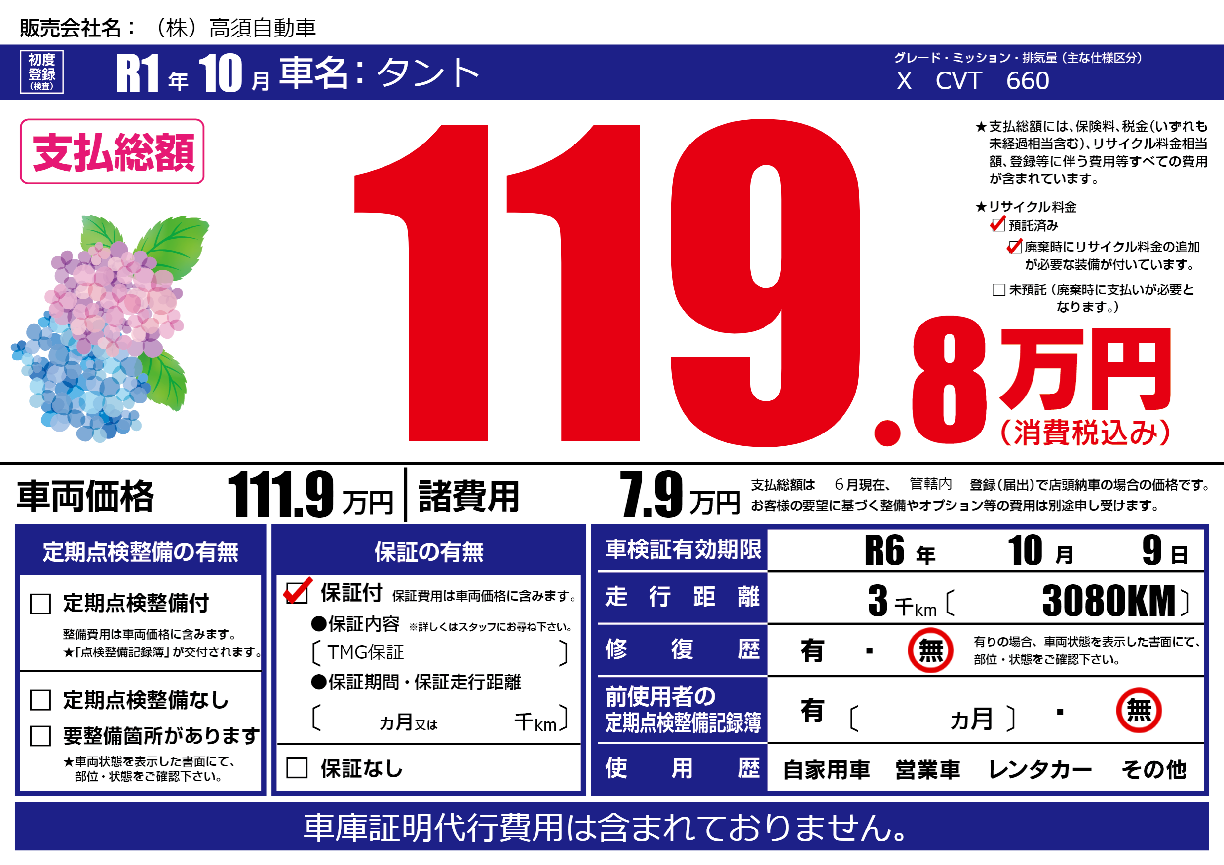 保証付き 保証内容(TMG保証) ---ヶ月または()千kmまで |