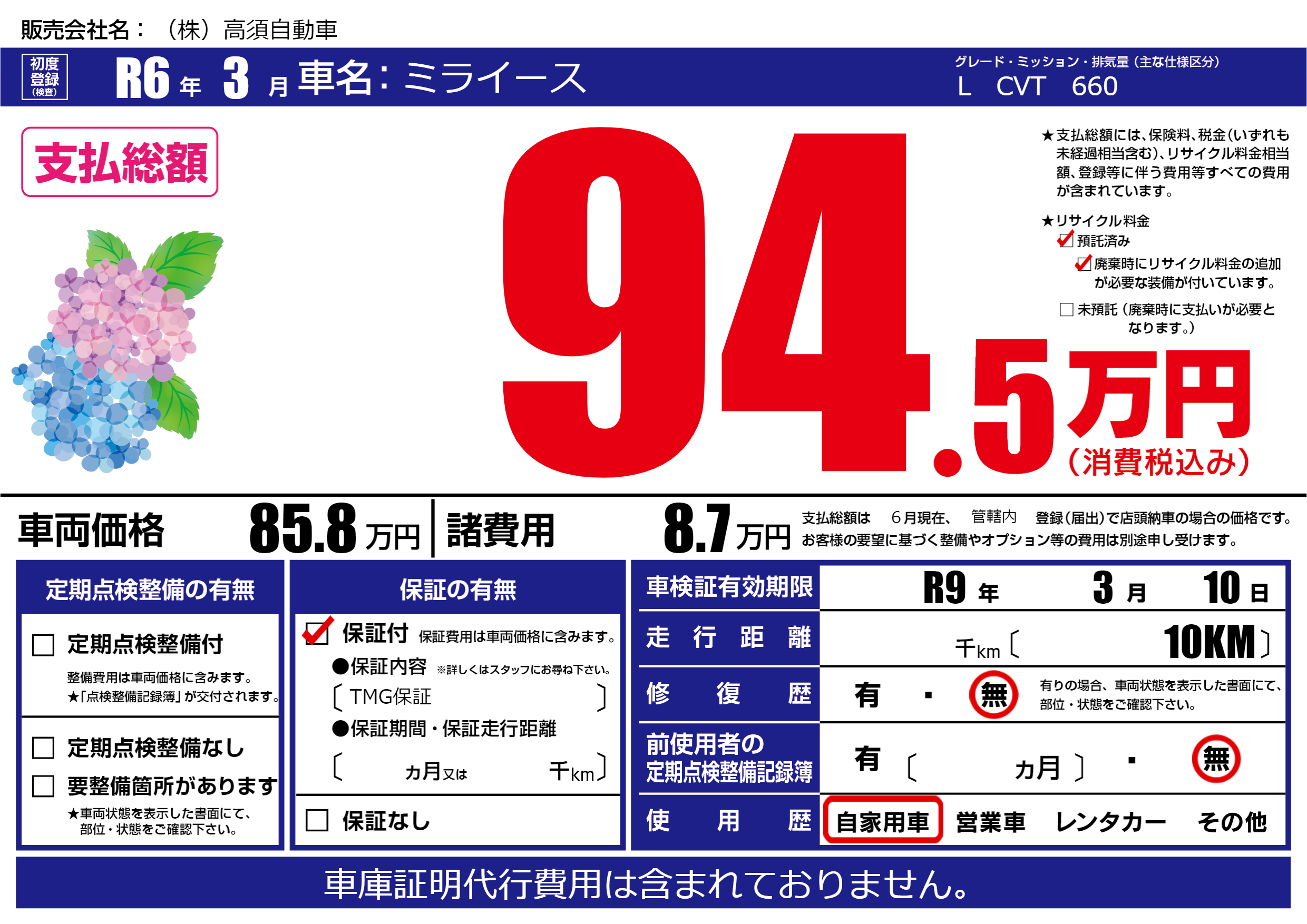 保証付き 保証内容(TMG保証) ---ヶ月または()千kmまで |