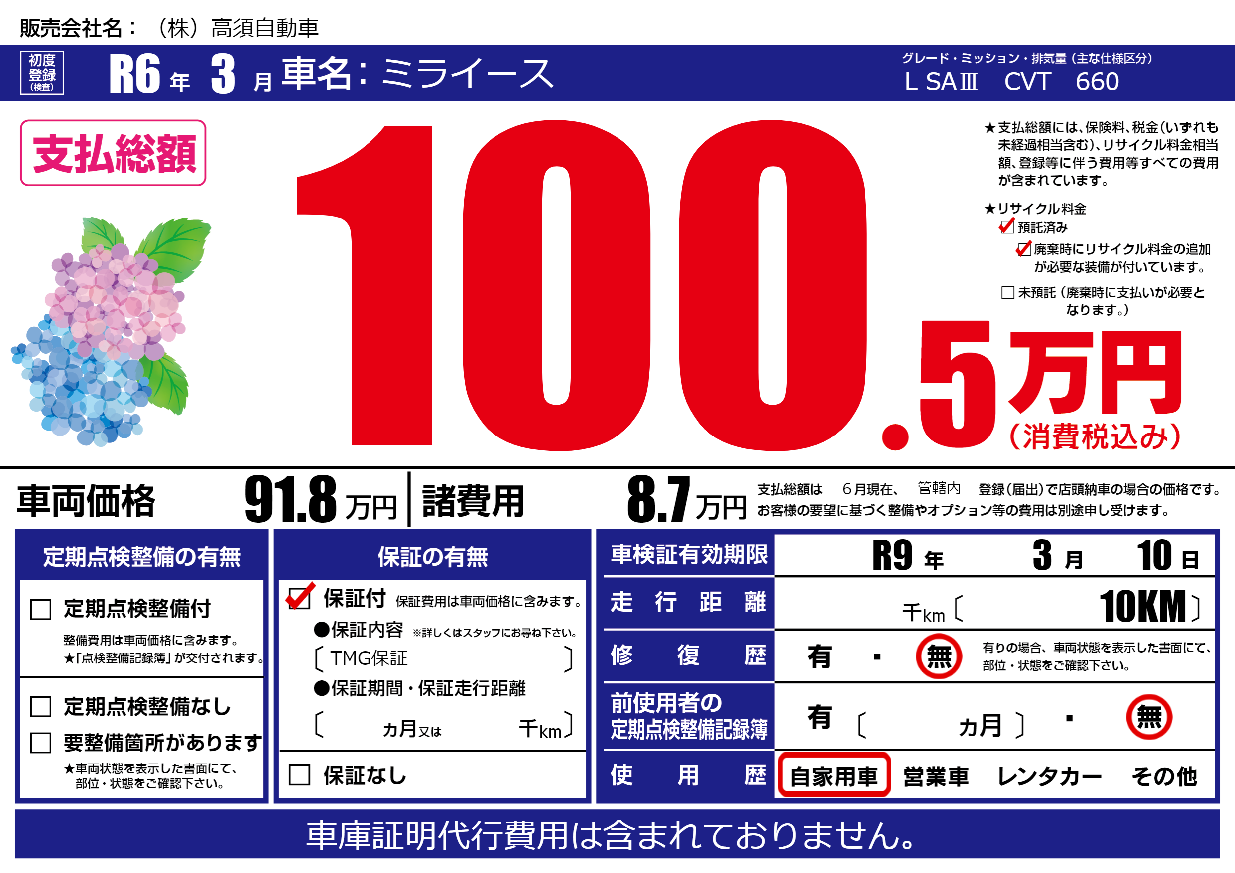 保証付き 保証内容(TMG保証) ---ヶ月または()千kmまで |