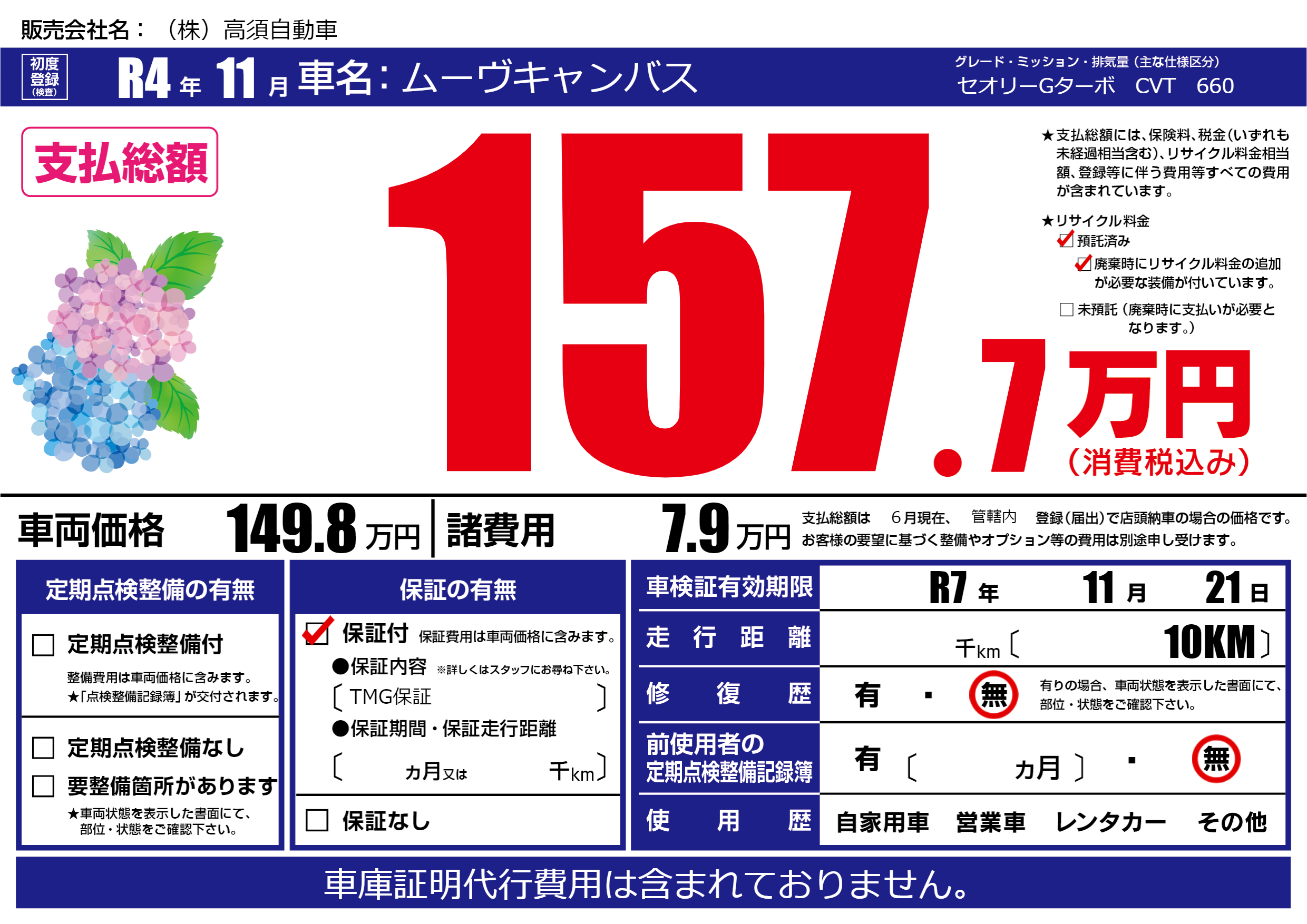 | 車名 | ムーヴキャンバス | グレード ミッション 排気量 |