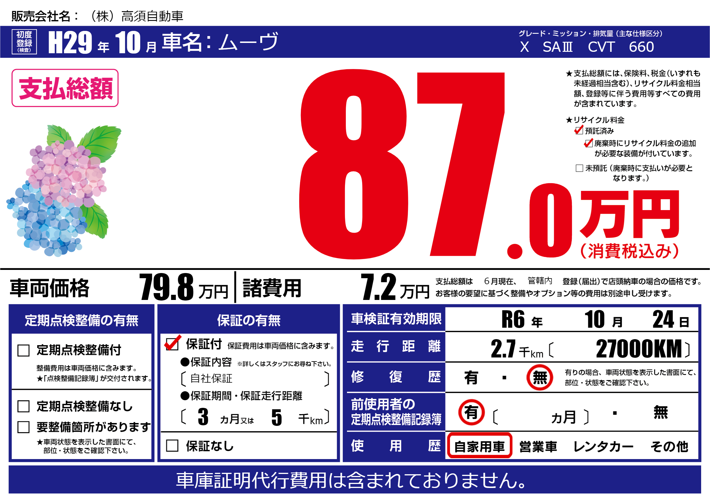 | 車名 | ムーヴ | グレード ミッション 排気量 |