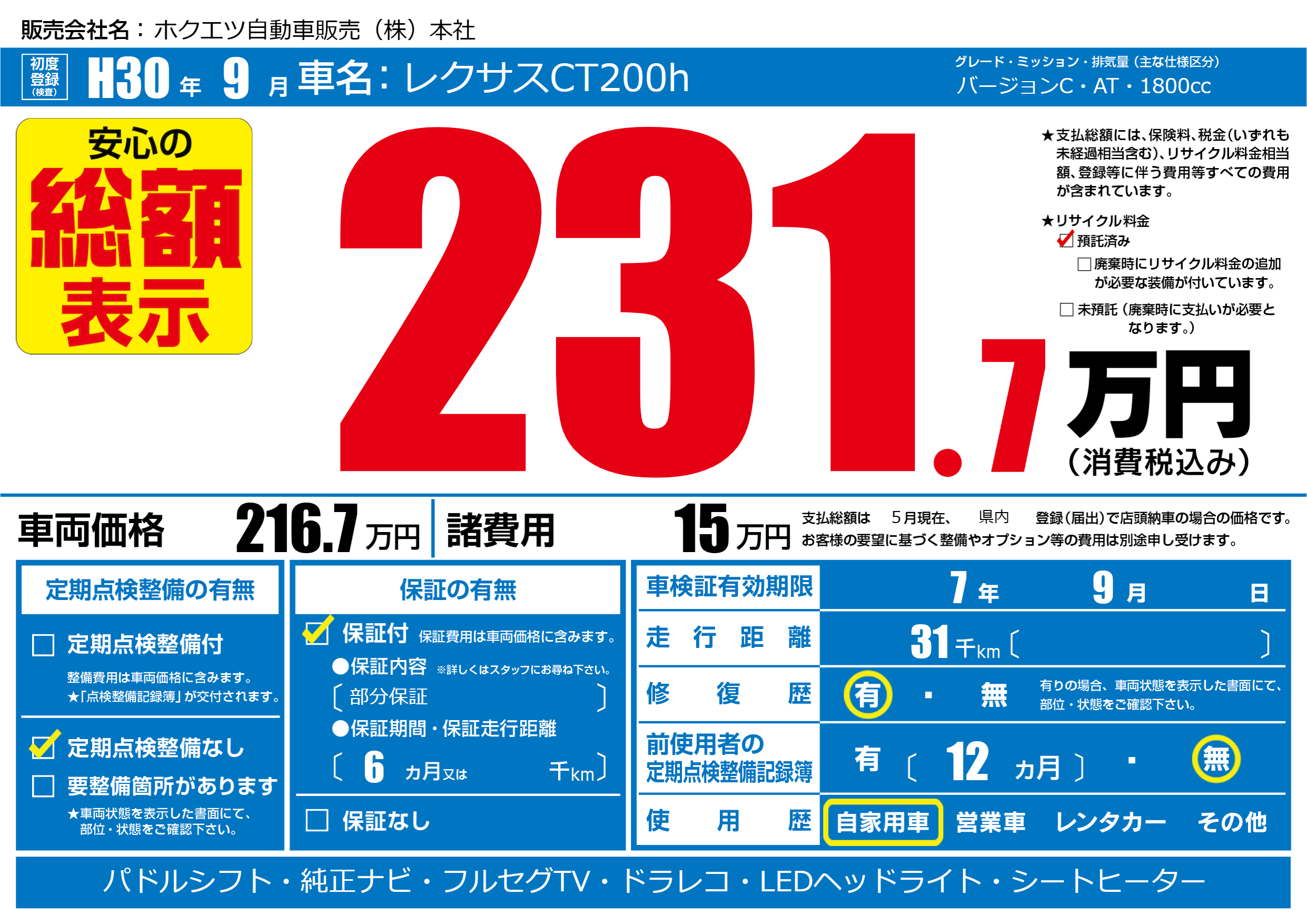 | 車名 | レクサスCT200h | グレード ミッション 排気量 |
