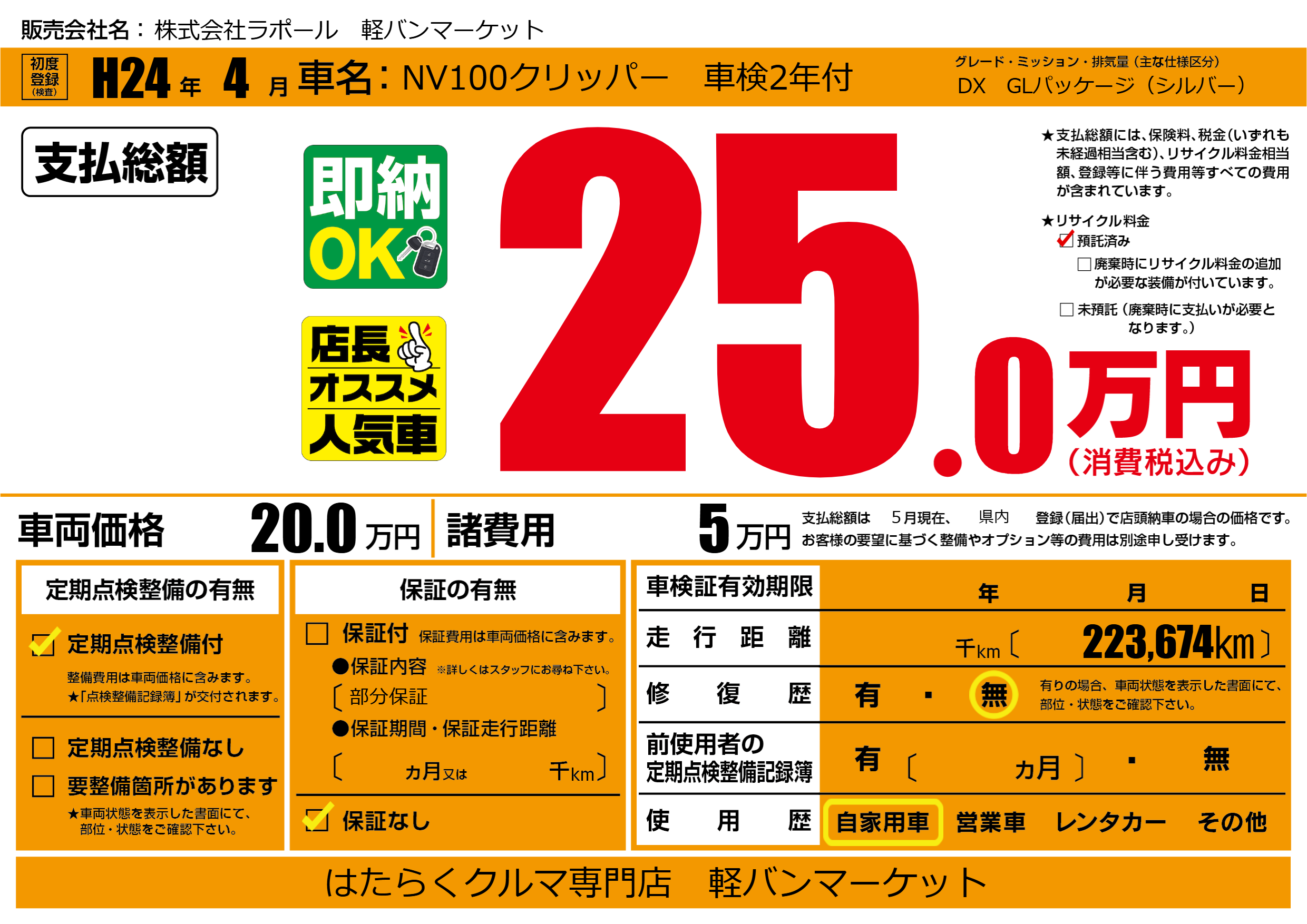 | 車名 | NV100クリッパー 車検2年付 | グレード ミッション 排気量 |