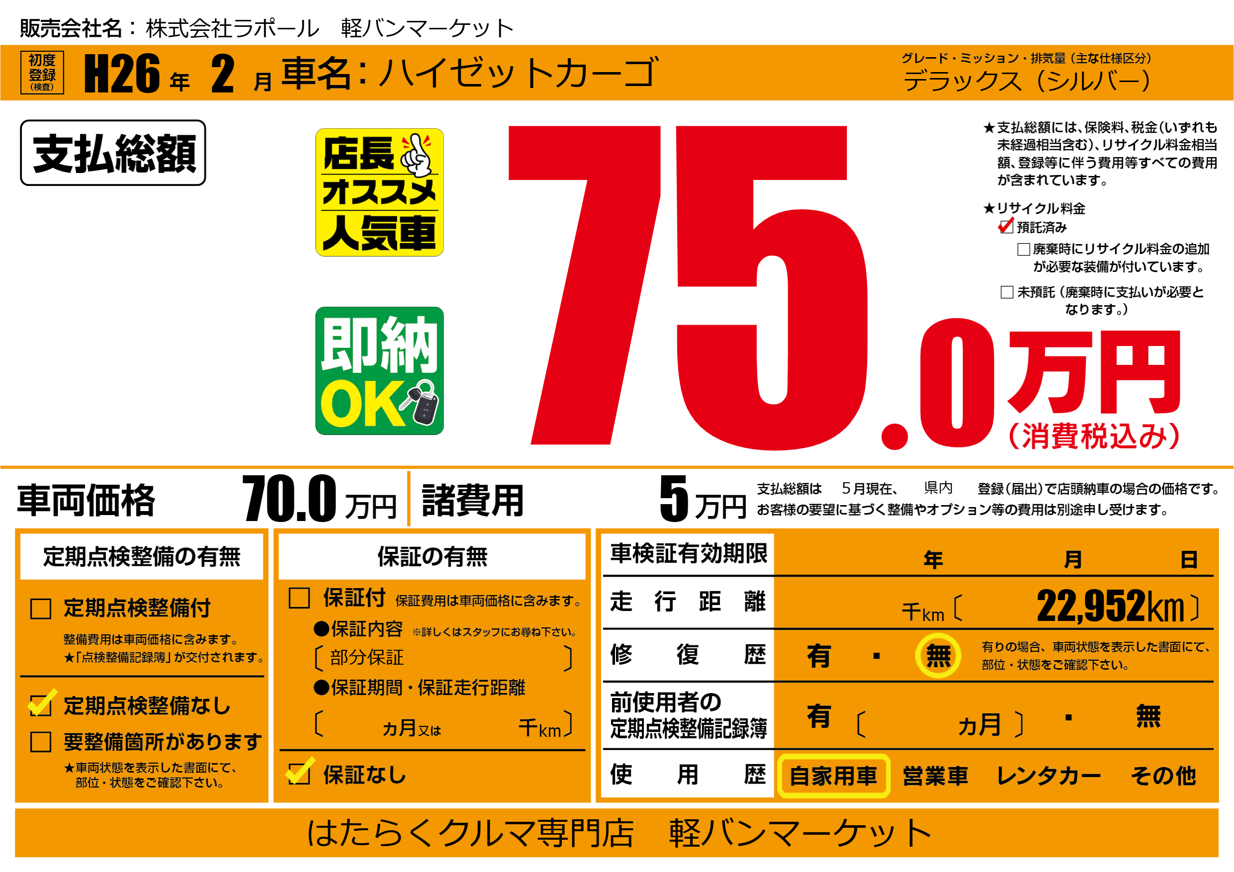 | 車名 | ハイゼットカーゴ | グレード ミッション 排気量 |