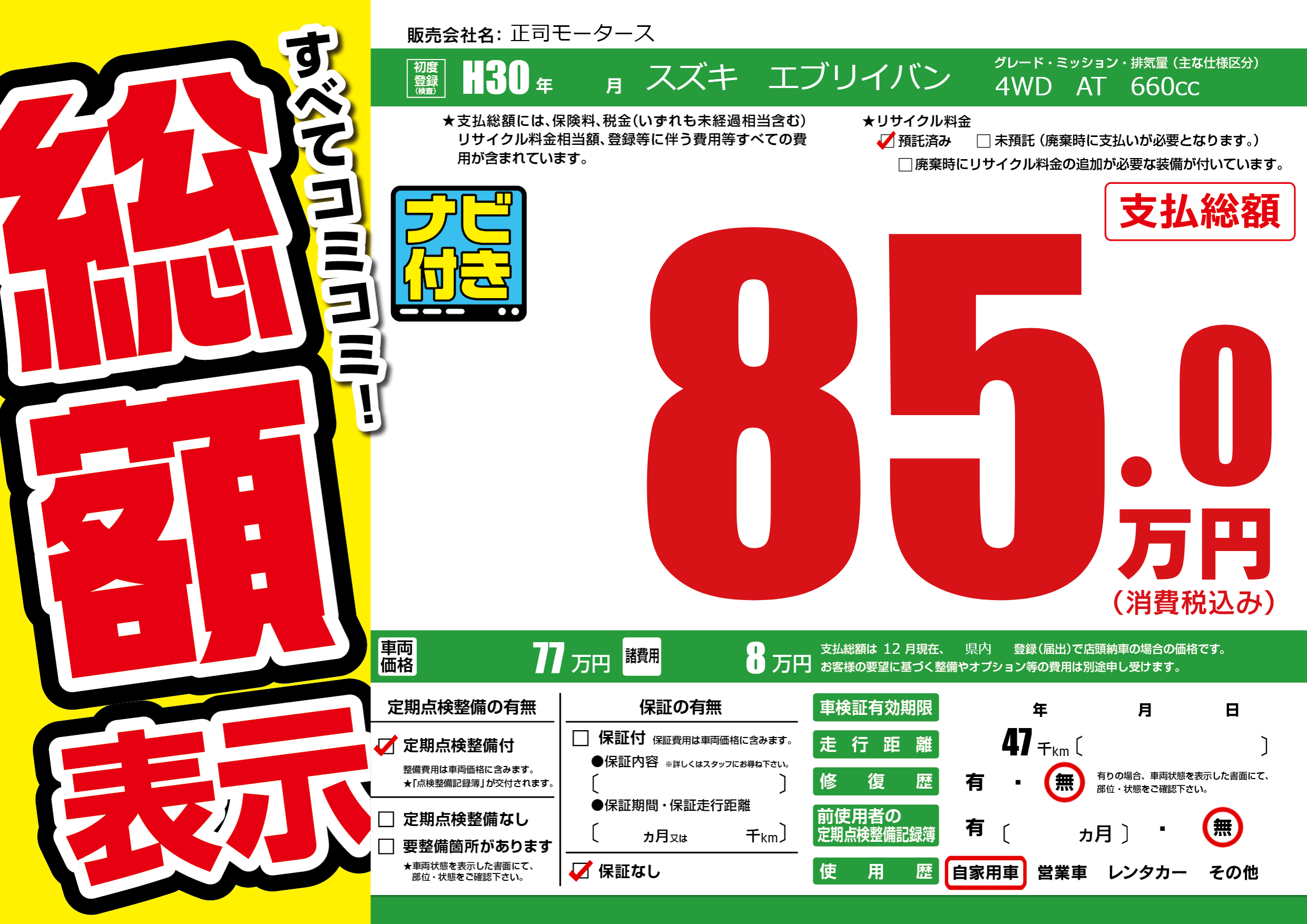 | 車名 | スズキ エブリイバン | グレード ミッション 排気量 |
