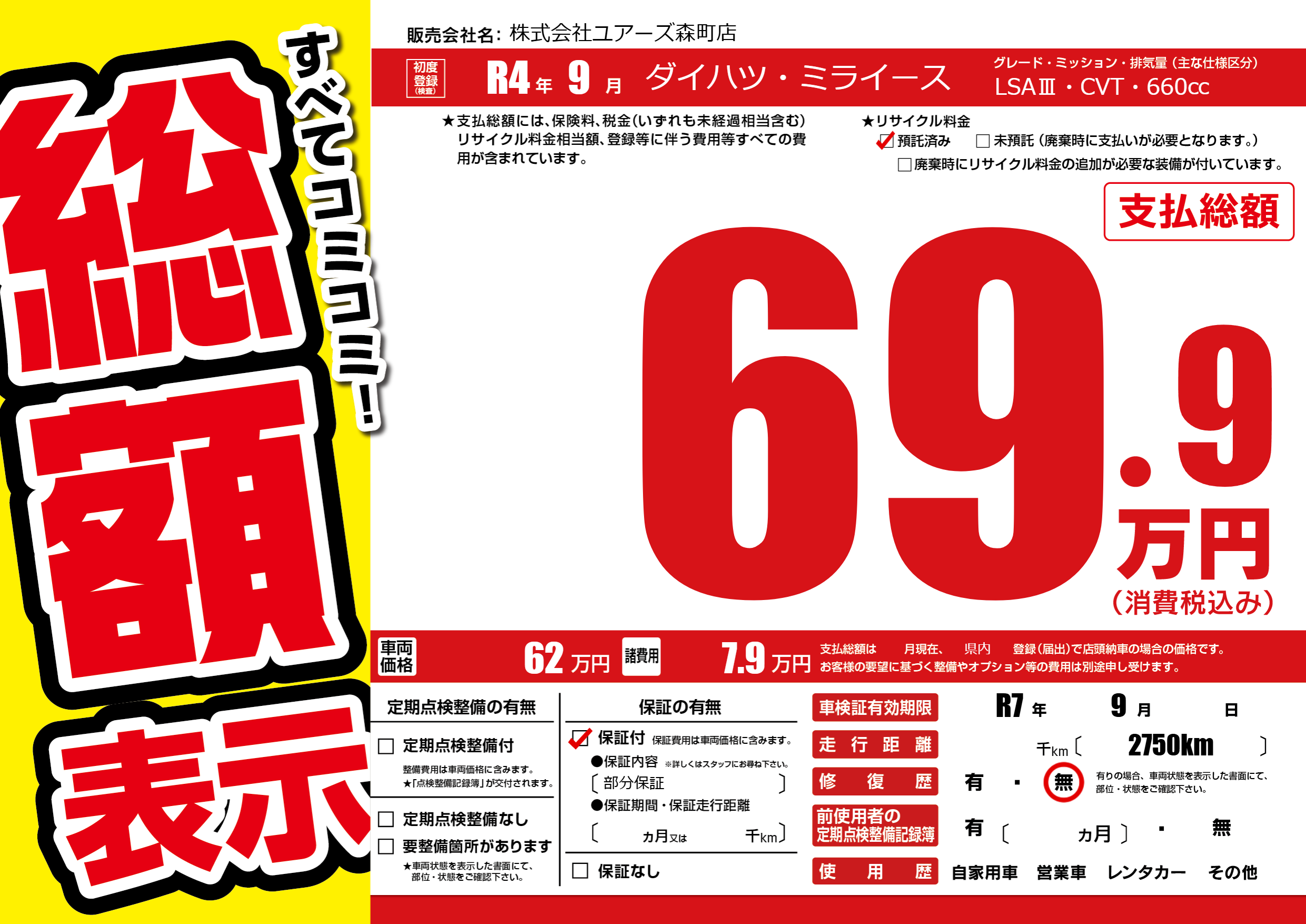 | 車検制限 | R7年 9月 - 日 | ||