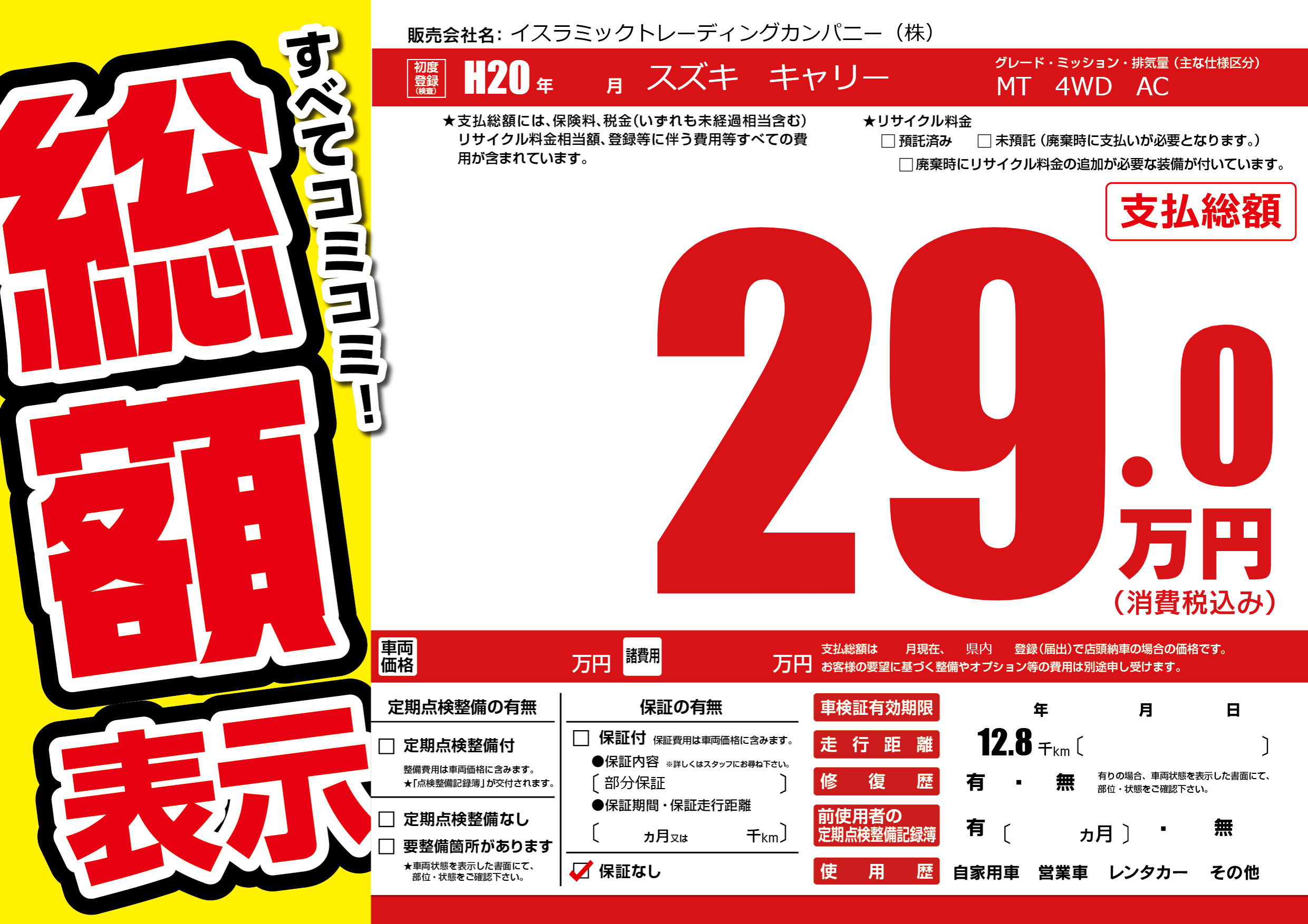 保証なし 保証内容(部分保証) ---ヶ月または()千kmまで |