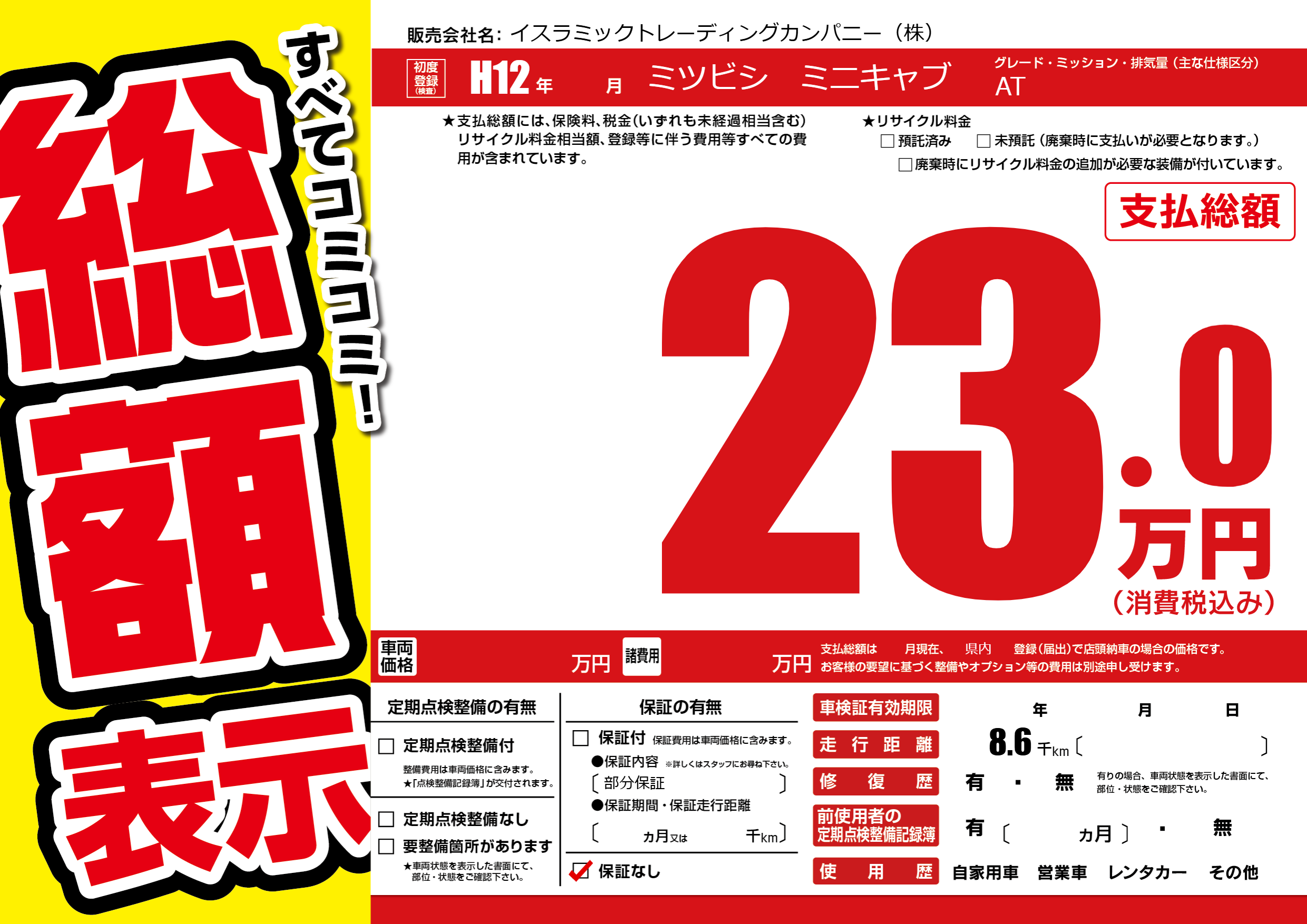 保証なし 保証内容(部分保証) ---ヶ月または()千kmまで |