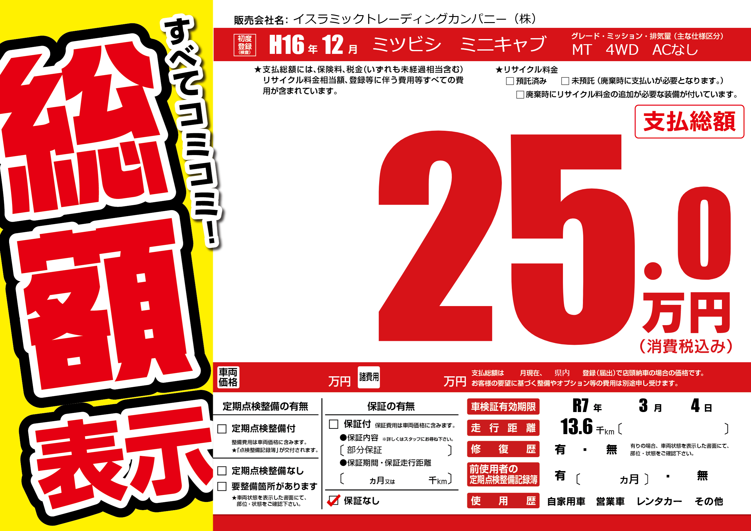 | 車名 | ミツビシ ミニキャブ | グレード ミッション 排気量 |