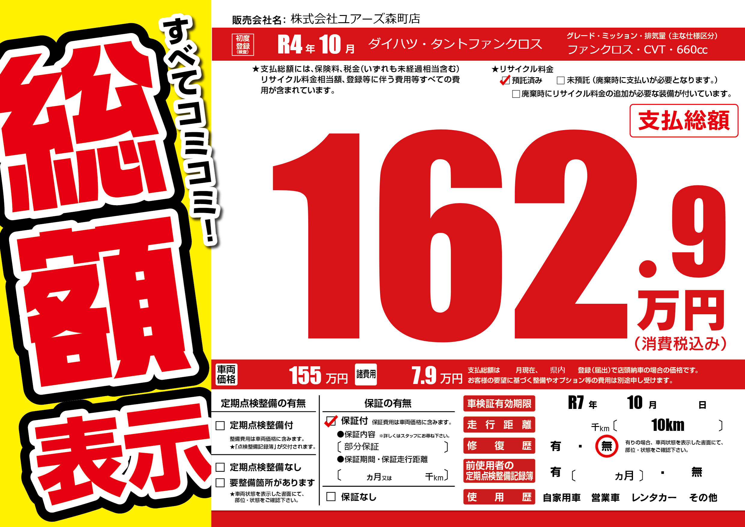 | 車名 | ダイハツ・タントファンクロス | グレード ミッション 排気量 |