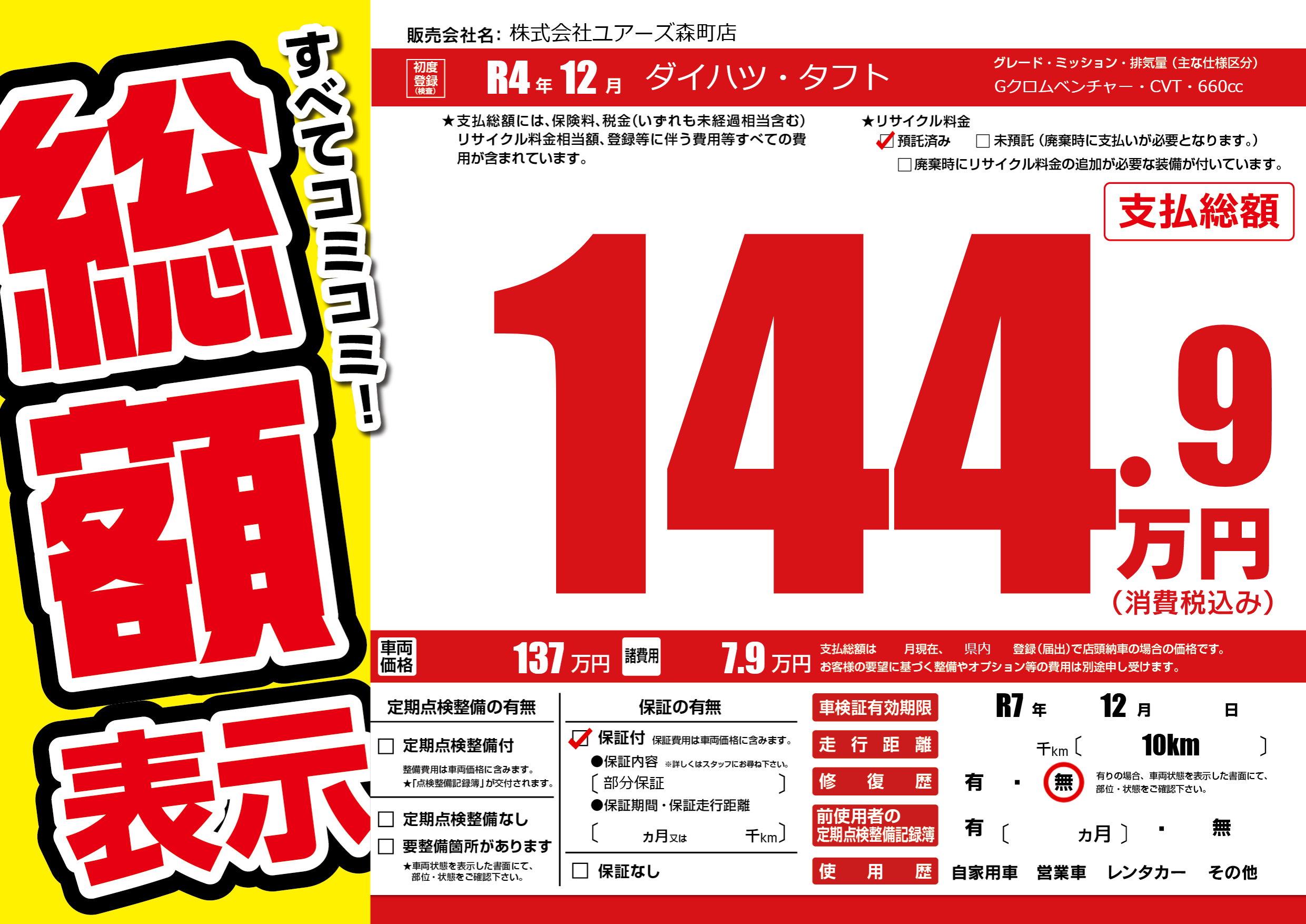| 走行キロ | - | 初年度登録 | R4年12月 |