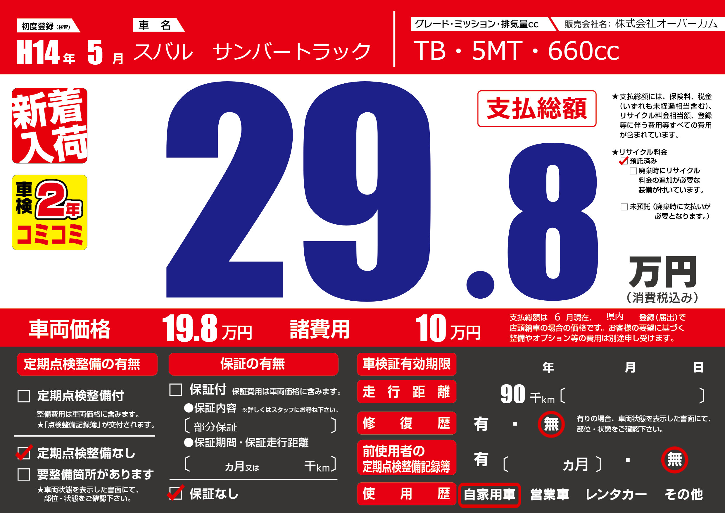 | 走行キロ | 9万km | 初年度登録 | H14年5月 |