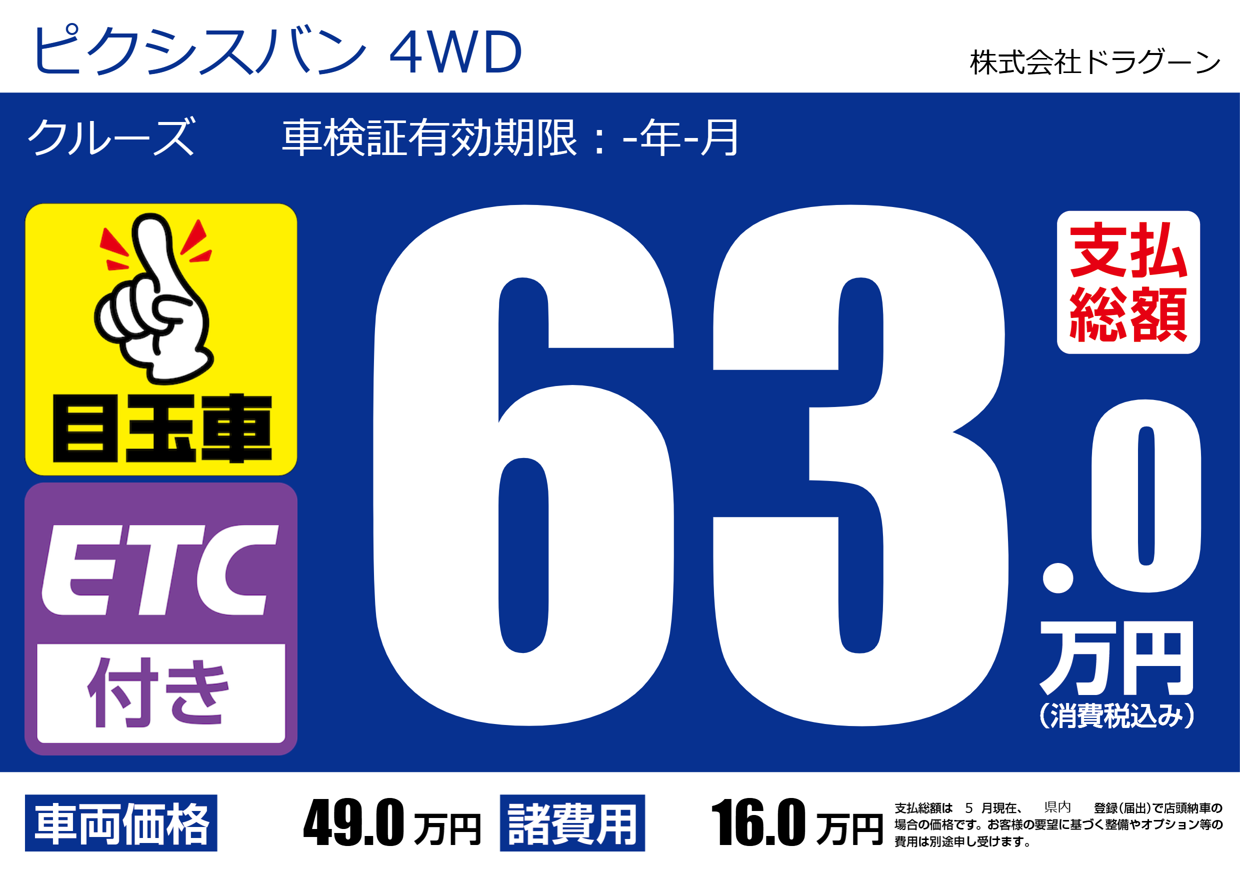 | 車名 | ピクシスバン 4WD | グレード ミッション 排気量 |