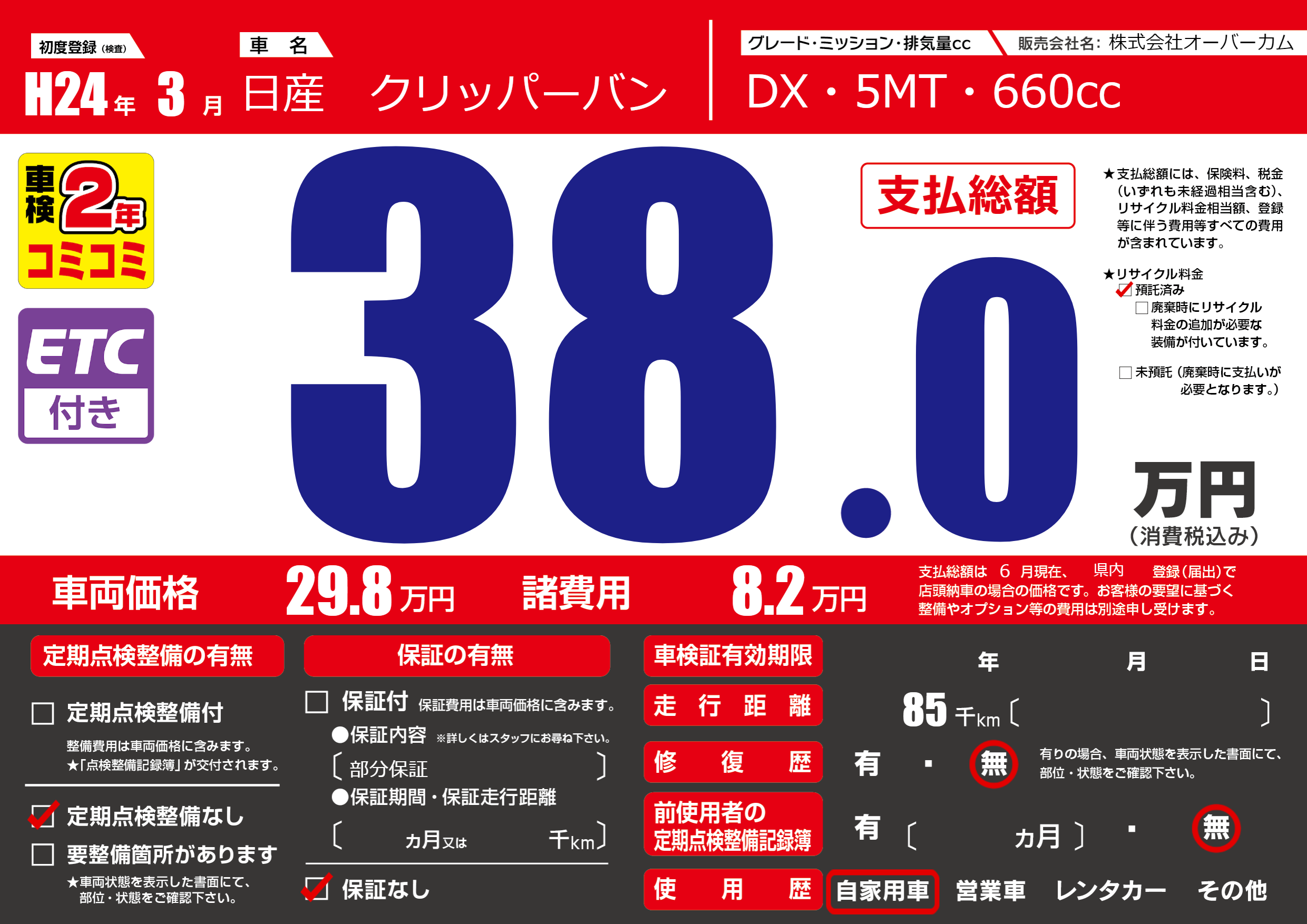 保証なし 保証内容(部分保証) ---ヶ月または()千kmまで |