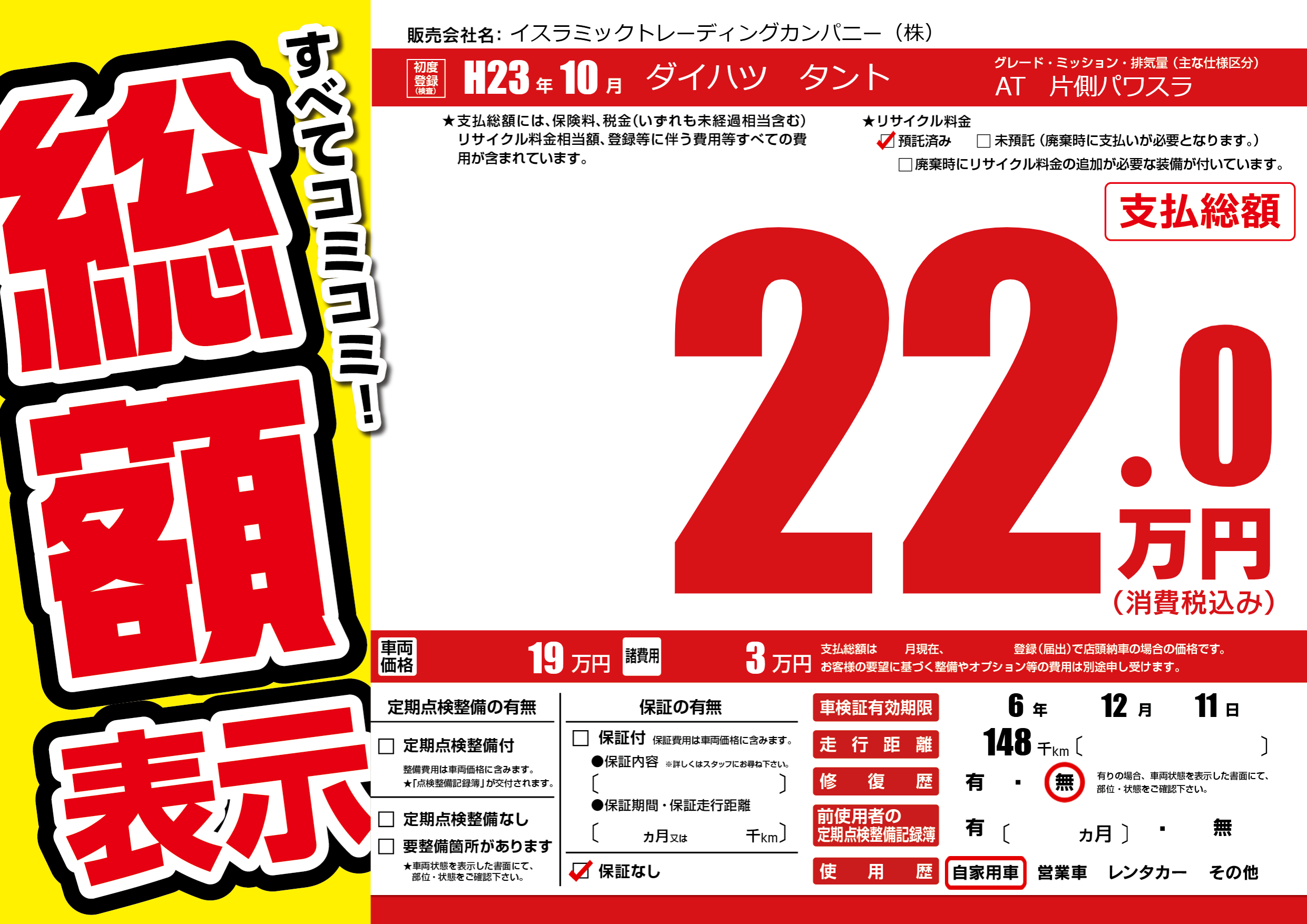 | 走行キロ | 14.8万km | 初年度登録 | H23年10月 |