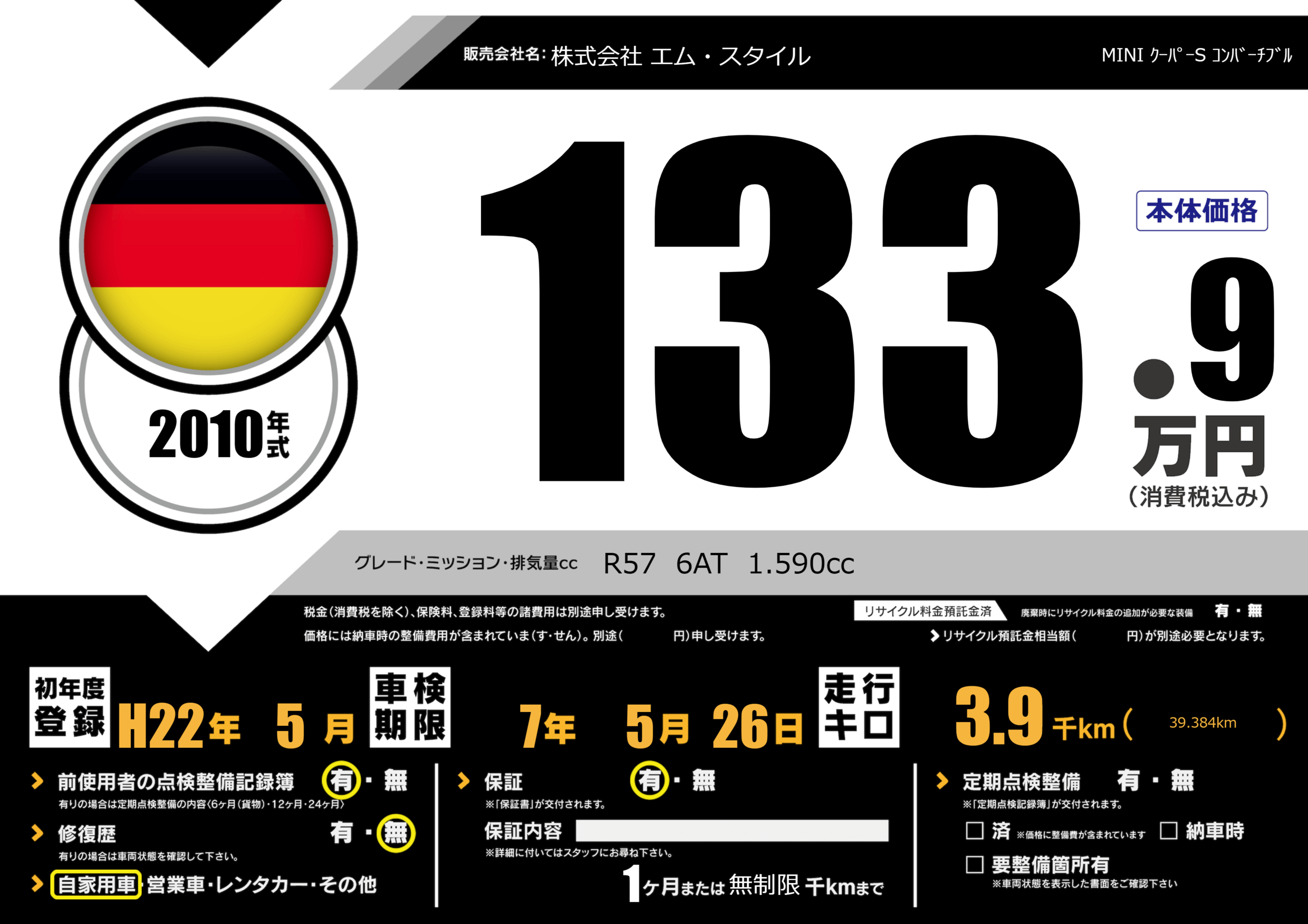 | 走行キロ | 0.3万km | 初年度登録 | H22年5月 |
