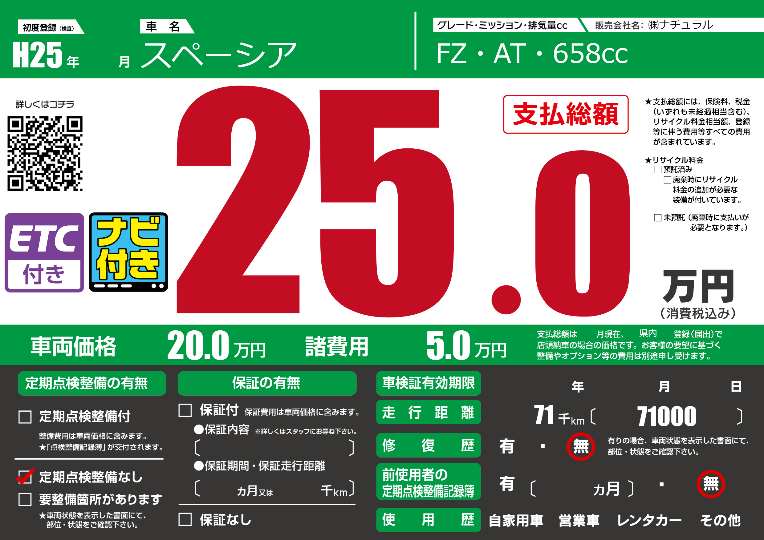 | 走行キロ | 7.1万km | 初年度登録 | H25年---月 |