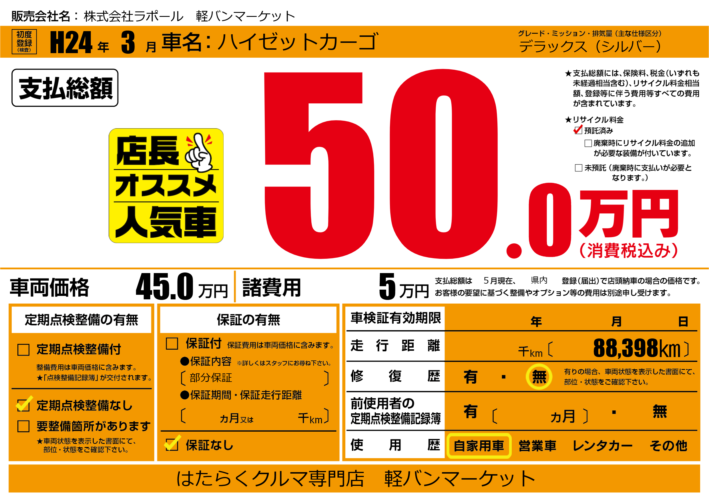 | 走行キロ | - | 初年度登録 | H24年3月 |