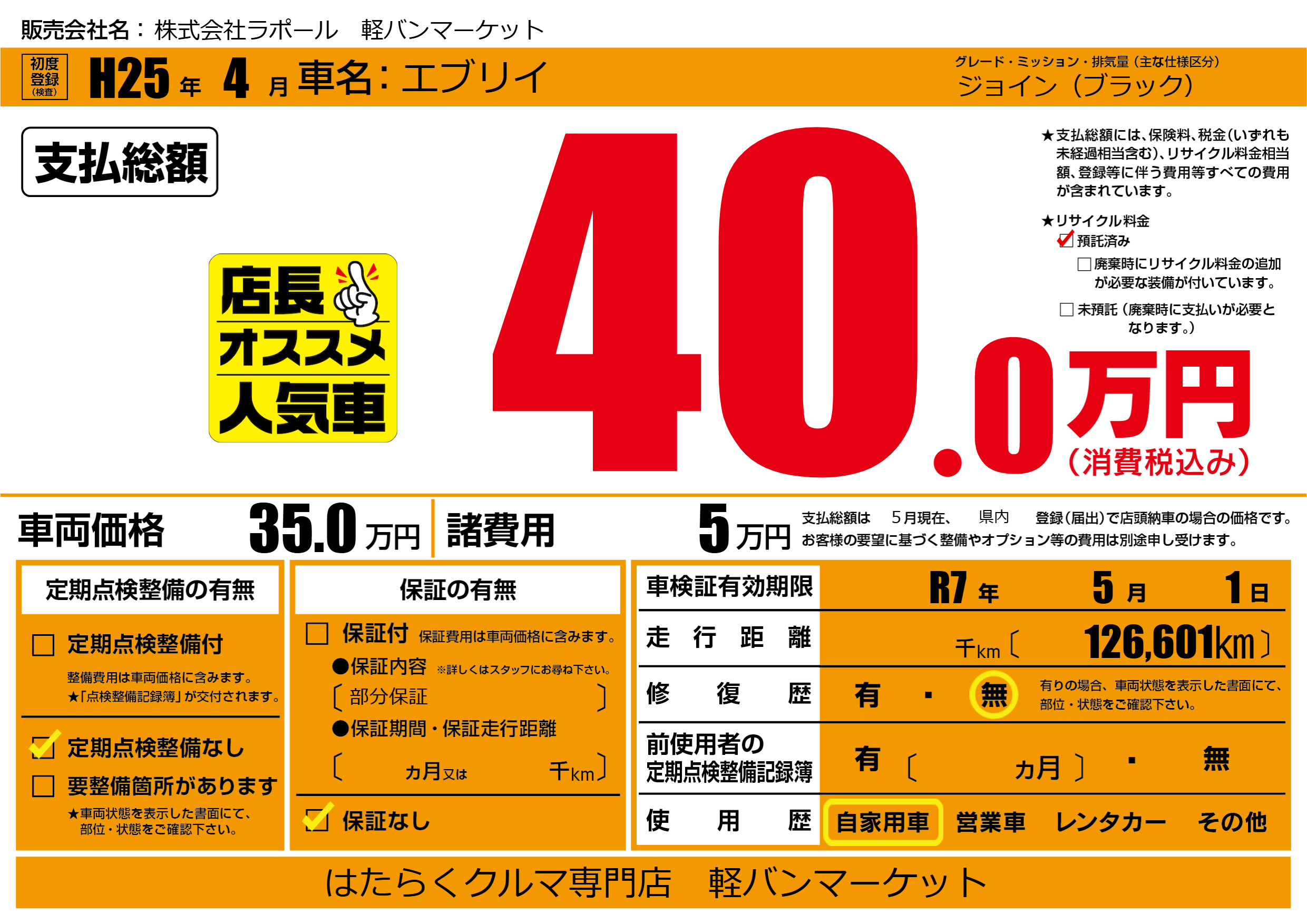 | 走行キロ | - | 初年度登録 | H25年4月 |