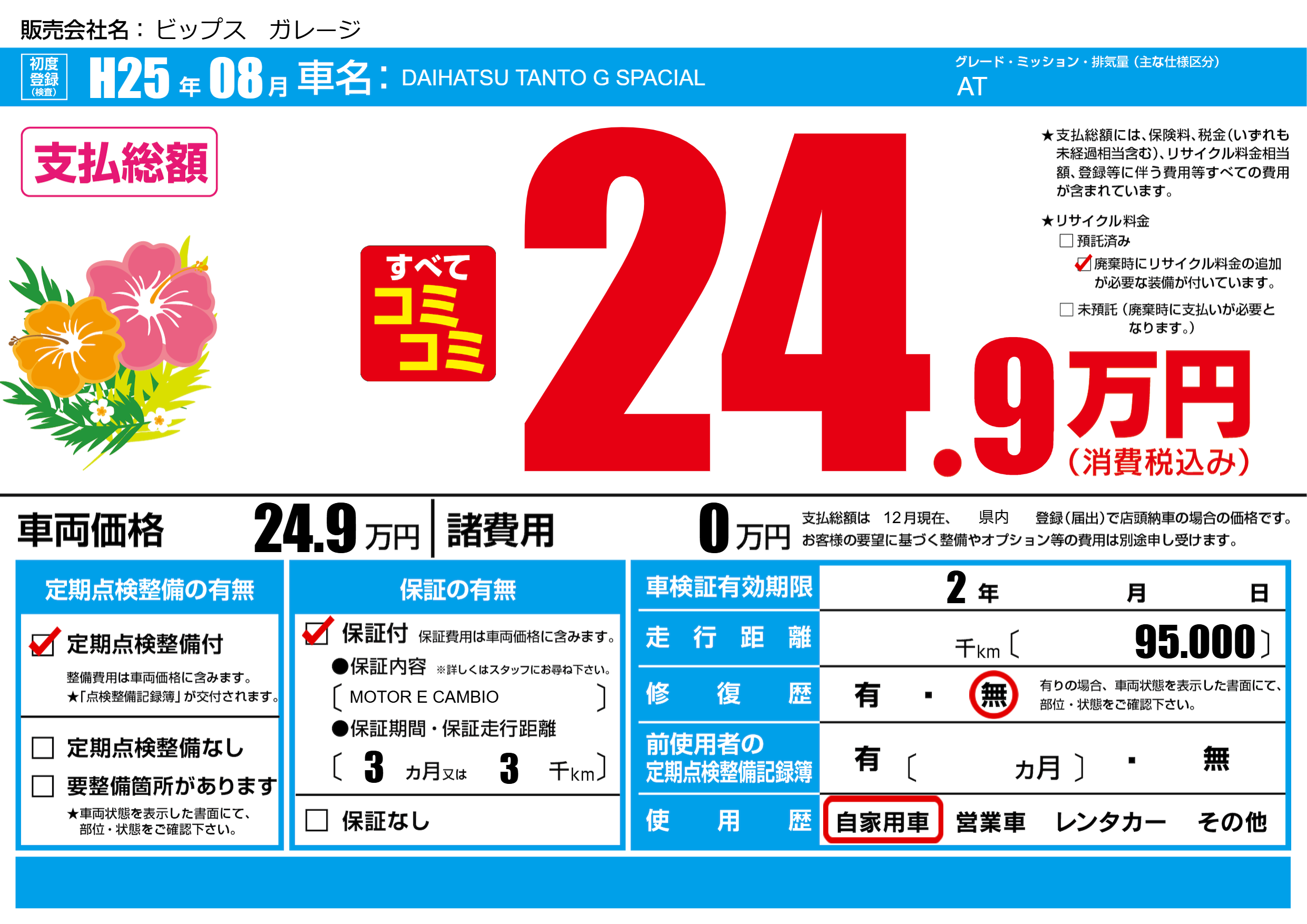| 車名 | DAIHATSU TANTO G SPACIAL | グレード ミッション 排気量 |