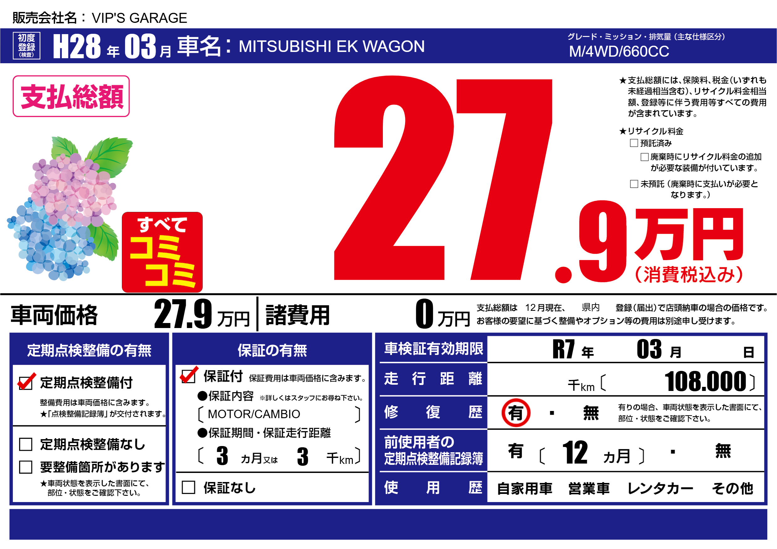 | 車名 | MITSUBISHI EK WAGON | グレード ミッション 排気量 |