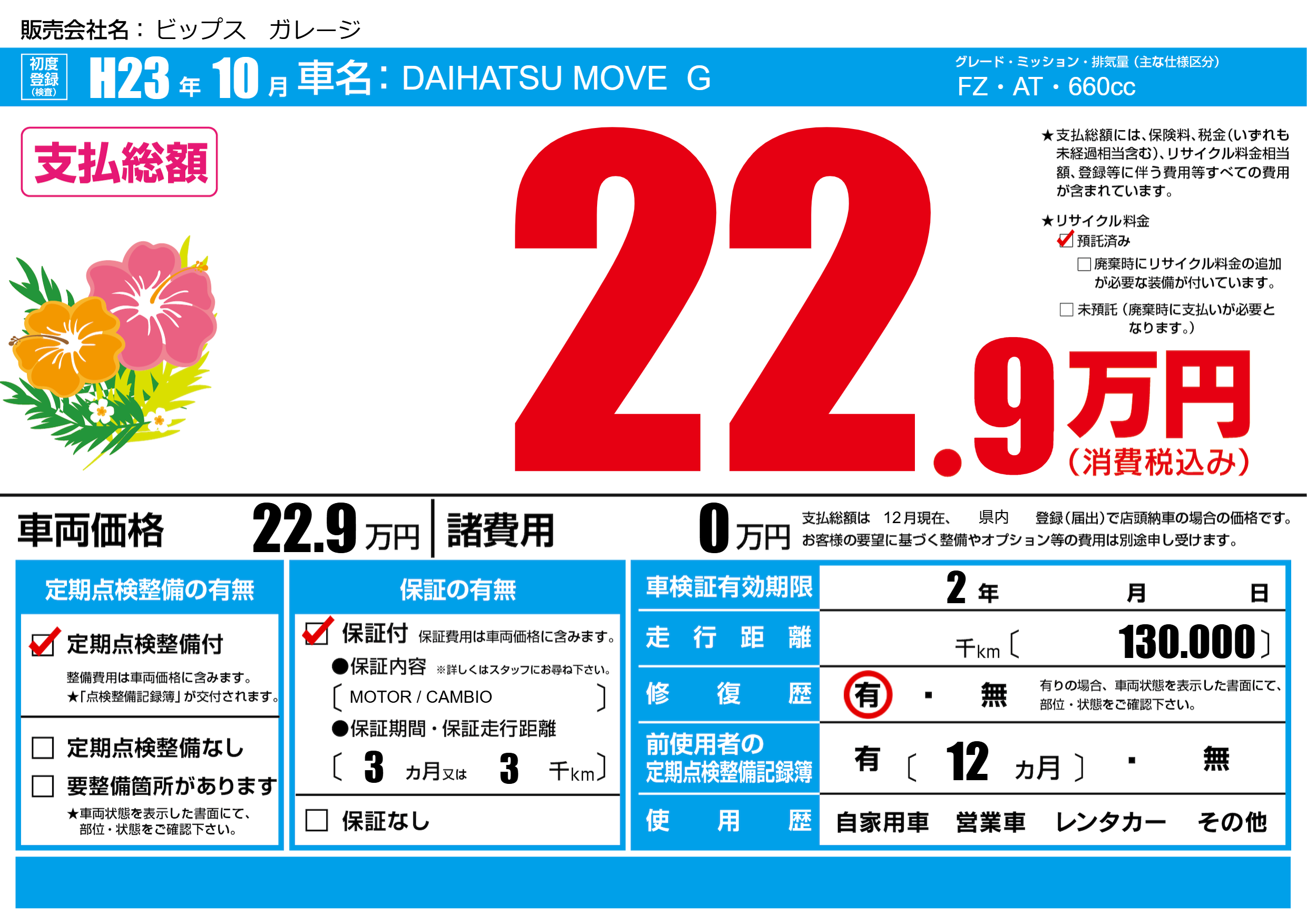 | 車名 | DAIHATSU MOVE G | グレード ミッション 排気量 |