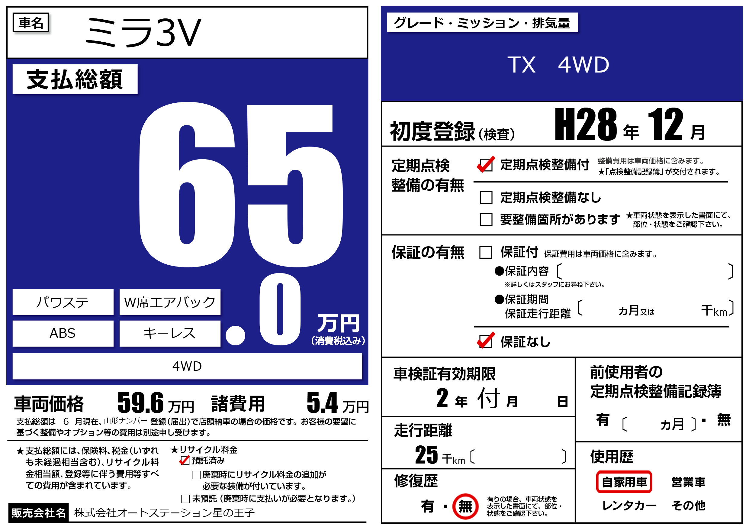 | 車名 | ミラ3V | グレード ミッション 排気量 |