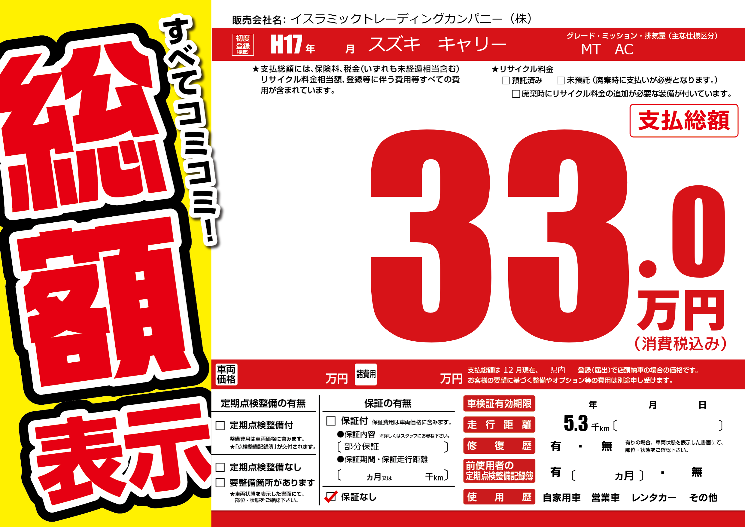 | 車名 | スズキ キャリー | グレード ミッション 排気量 |