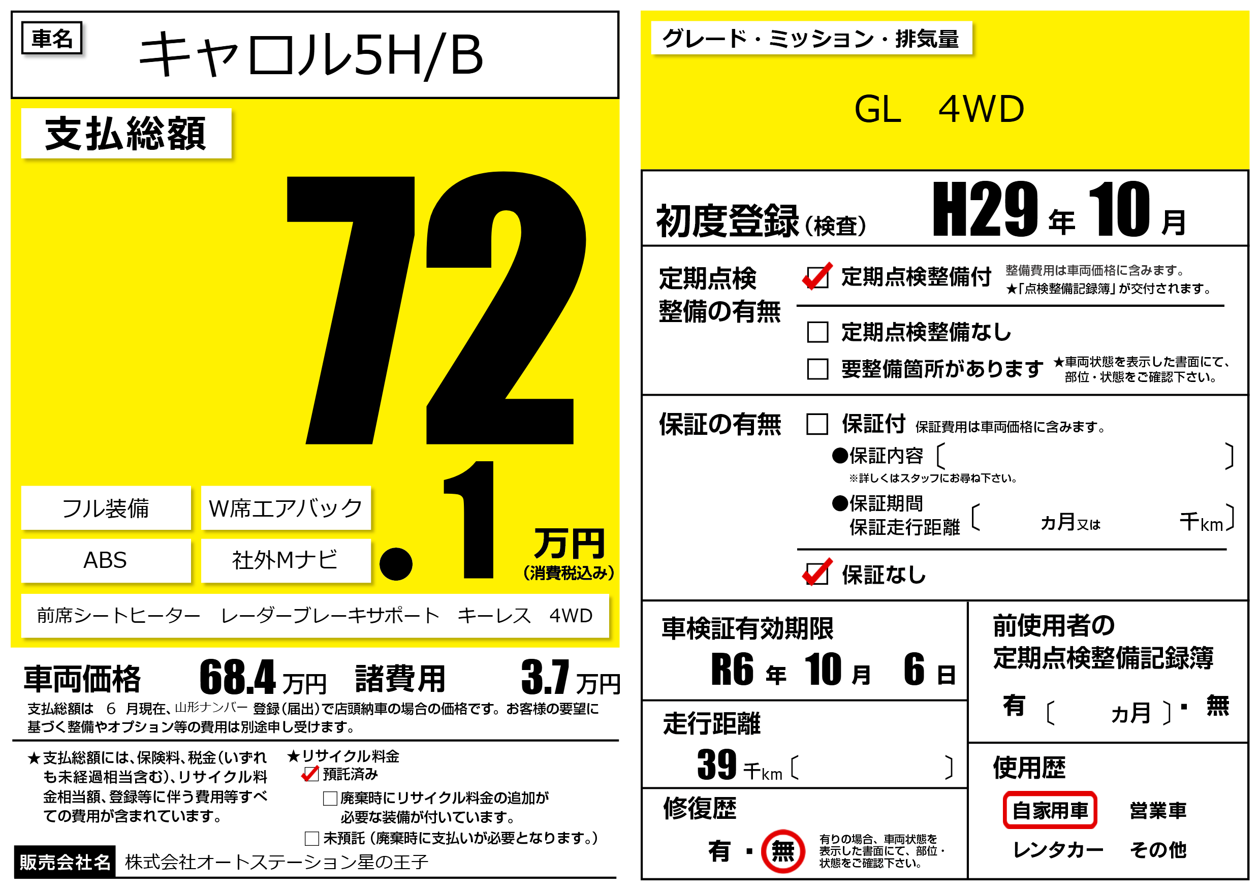 | 車名 | キャロル5H/B | グレード ミッション 排気量 |
