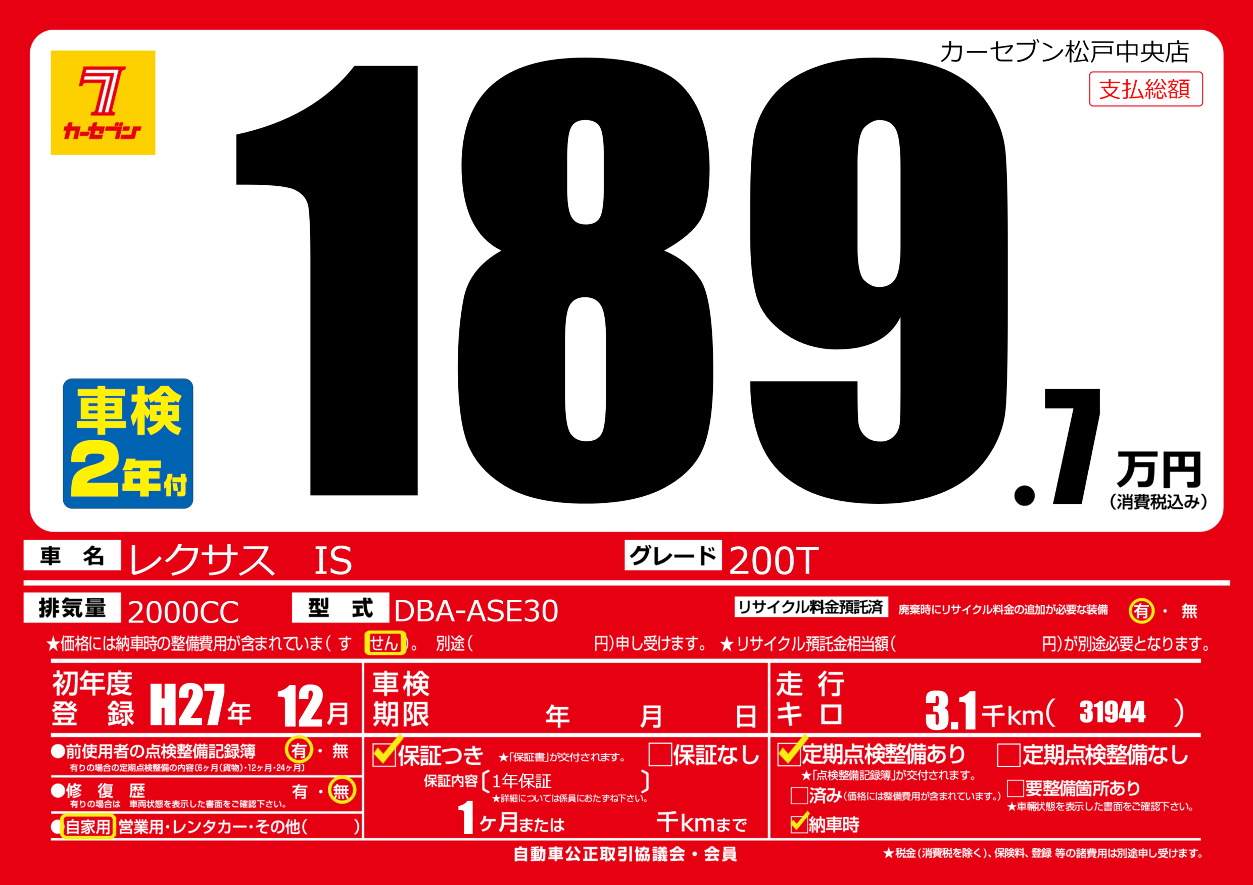 | 車名 | レクサス IS | グレード ミッション 排気量 |