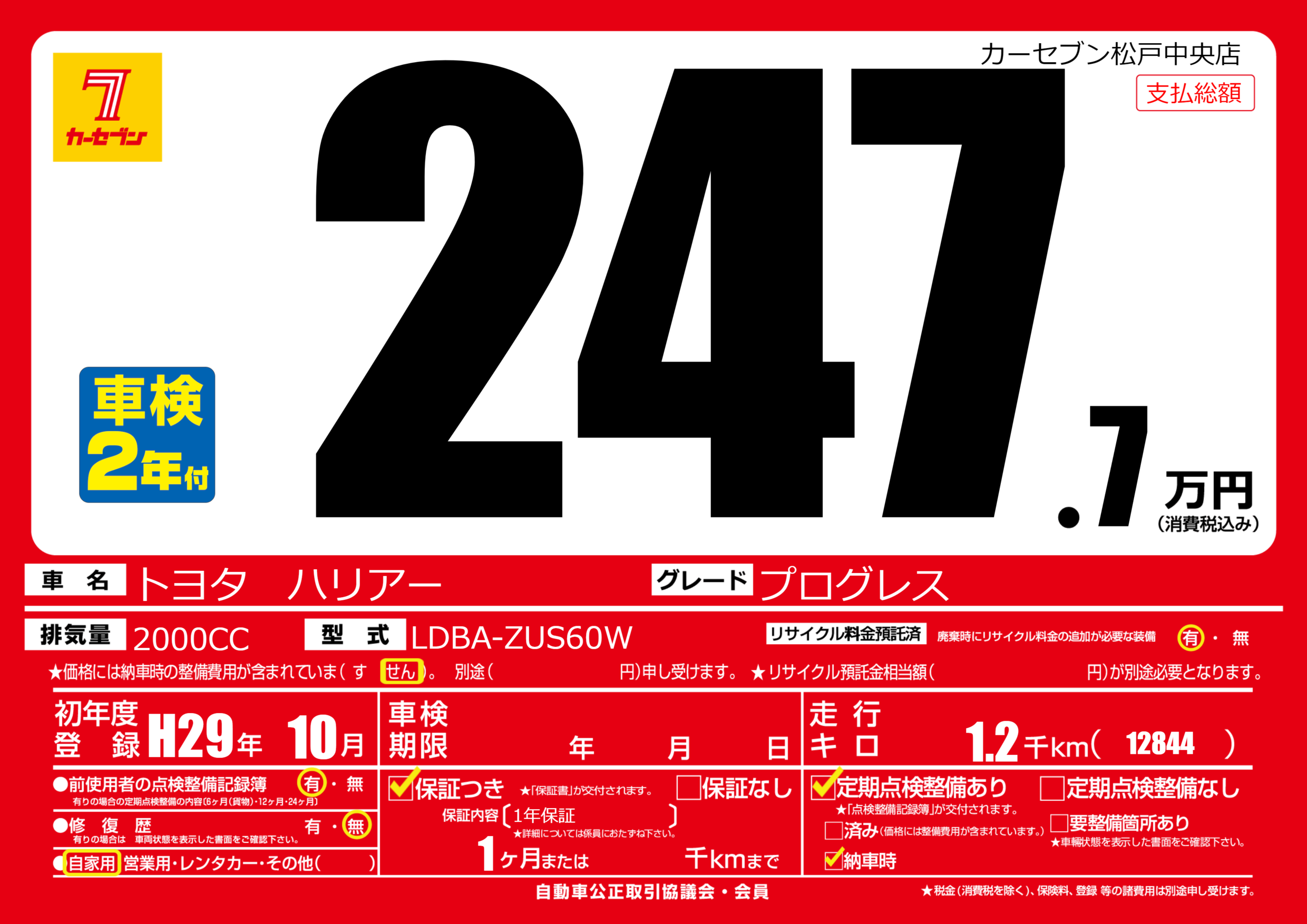 | 走行キロ | 0.1万km | 初年度登録 | H29年10月 |