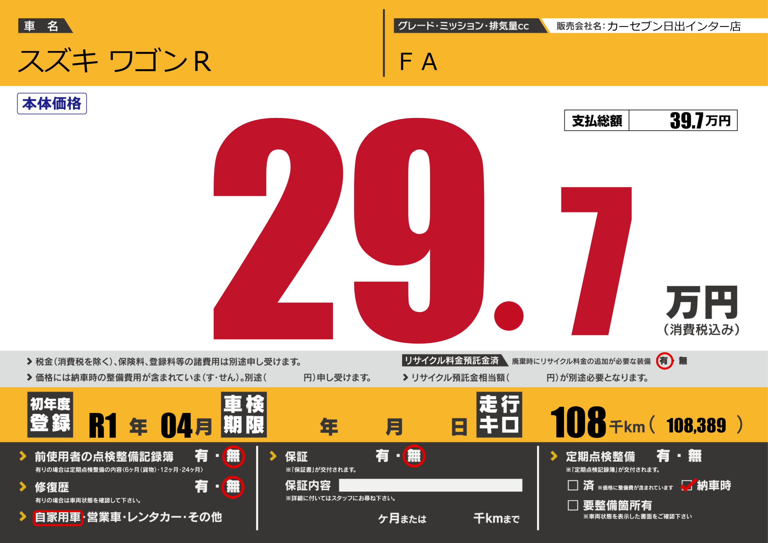 | 車名 | スズキ ワゴンR | グレード ミッション 排気量 |