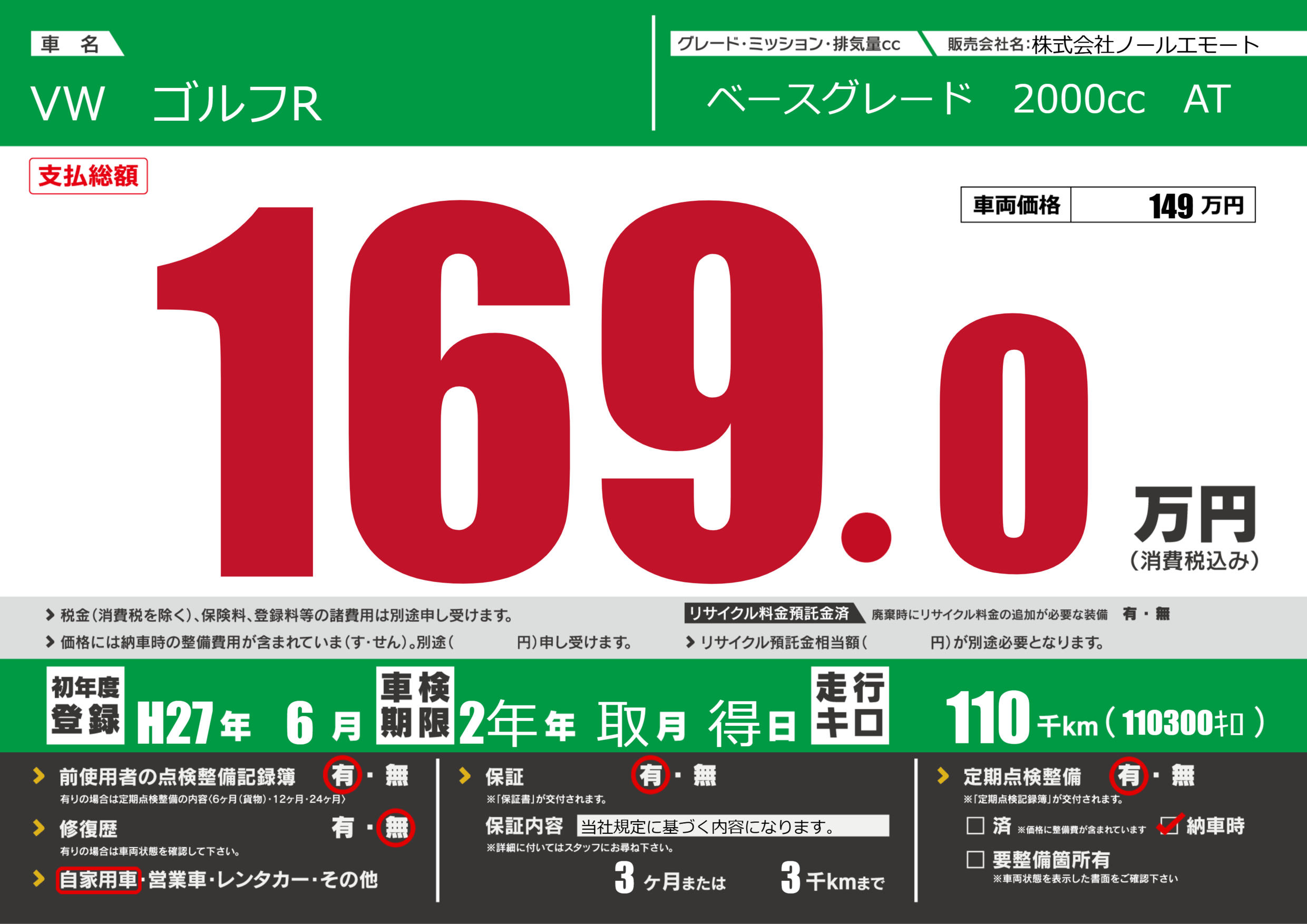 | 車名 | VW ゴルフR | グレード ミッション 排気量 |