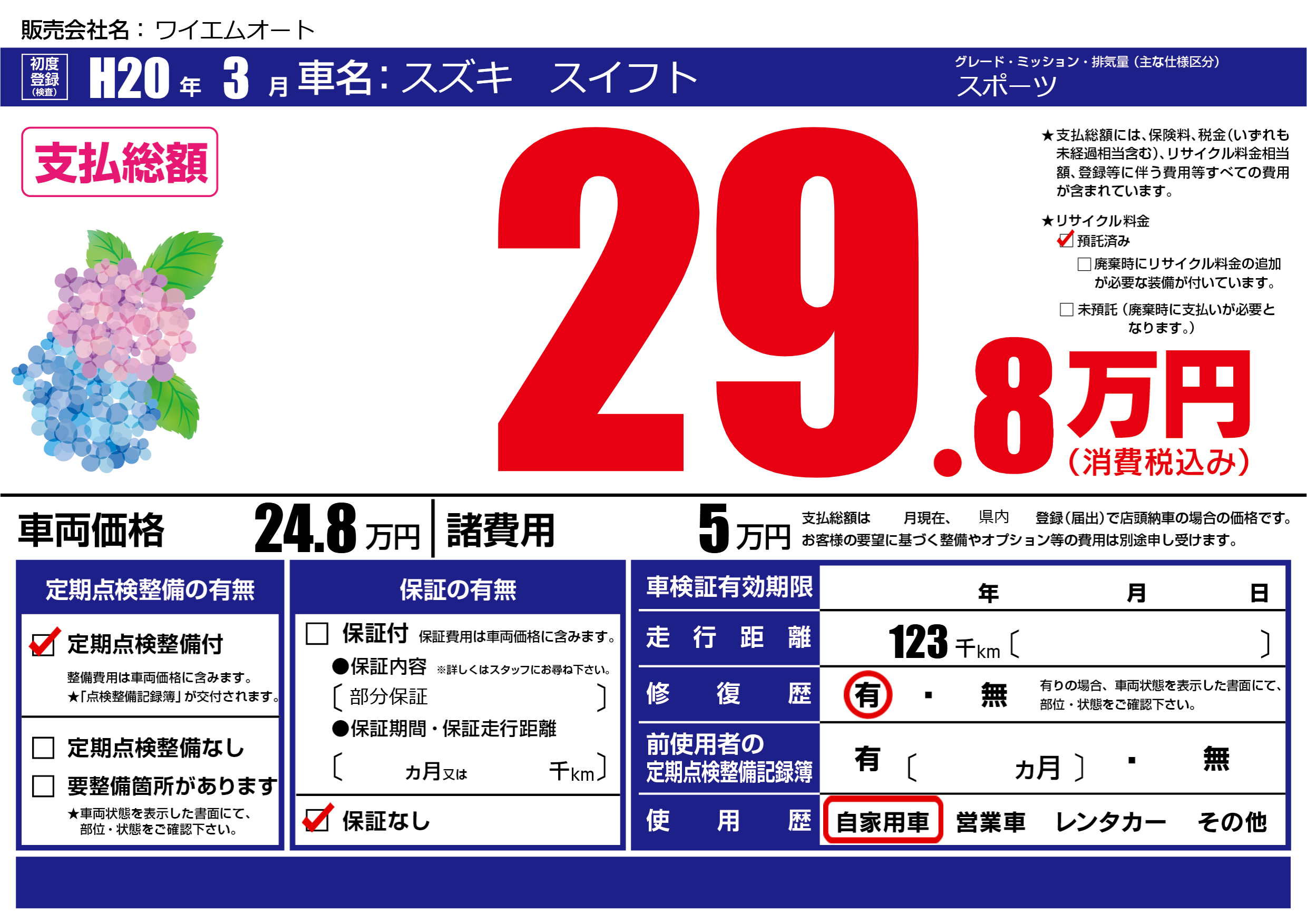 保証なし 保証内容(部分保証) ---ヶ月または()千kmまで |