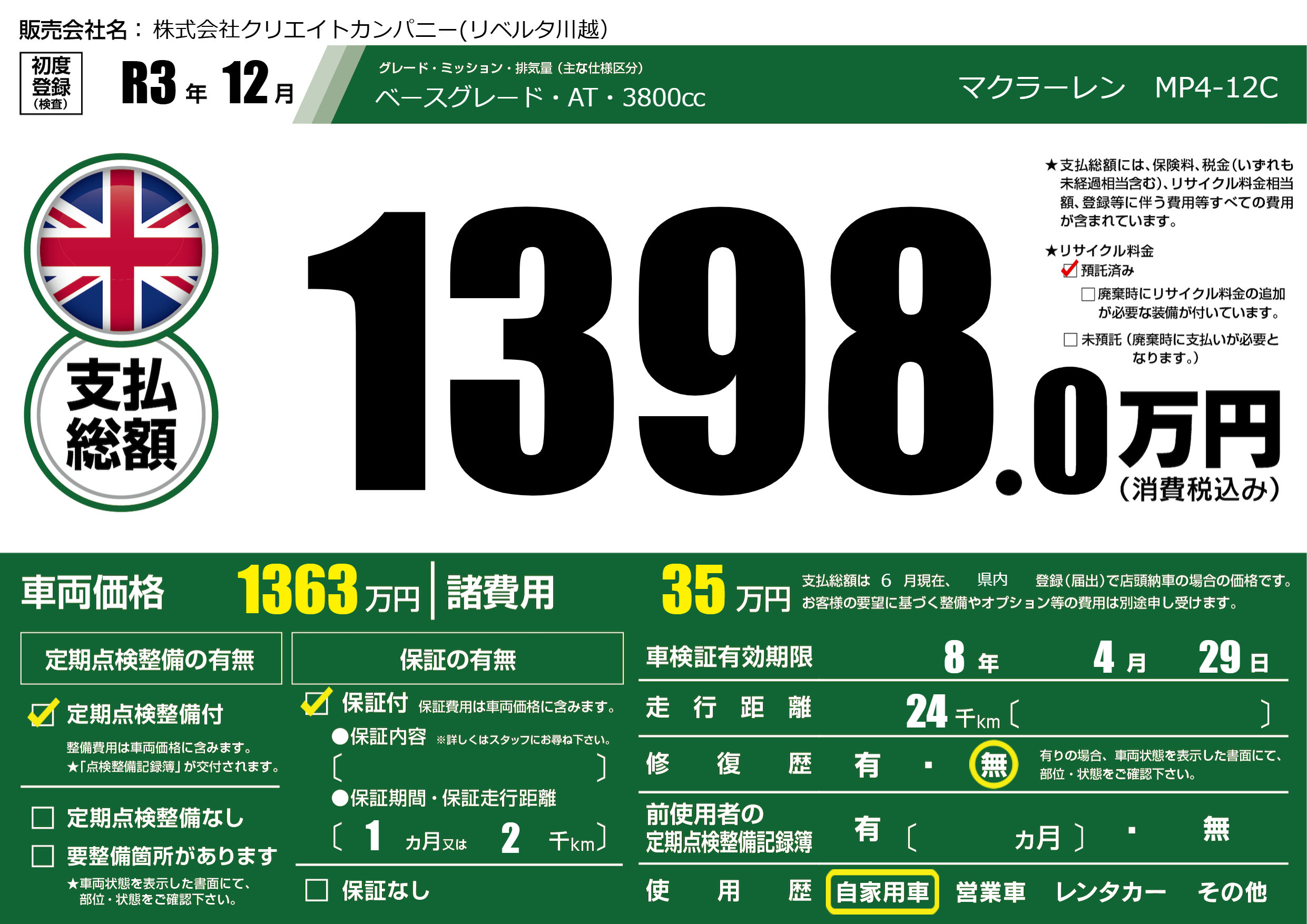 | 車名 | マクラーレン MP4-12C | グレード ミッション 排気量 |