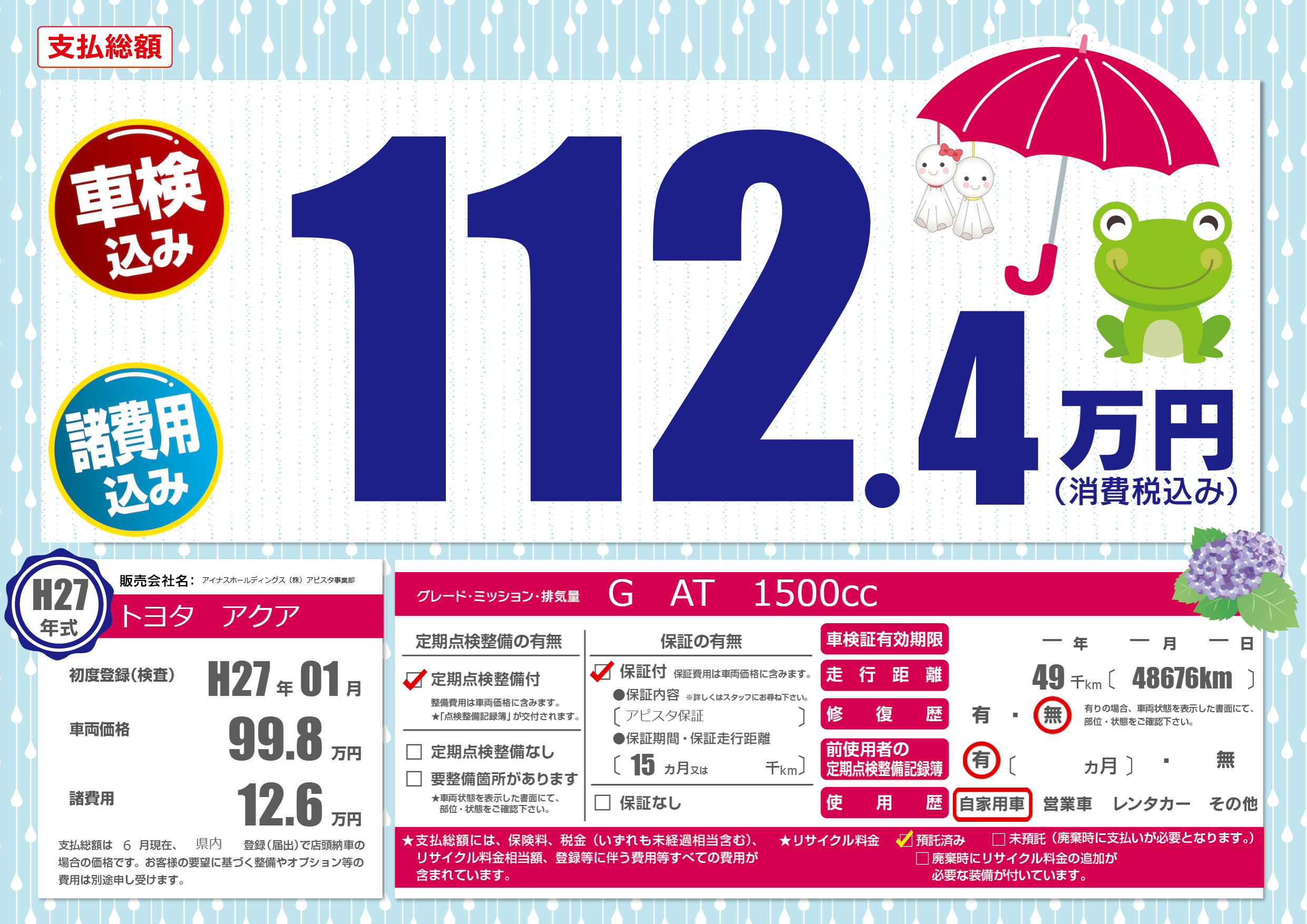 | 車名 | トヨタ アクア | グレード ミッション 排気量 |