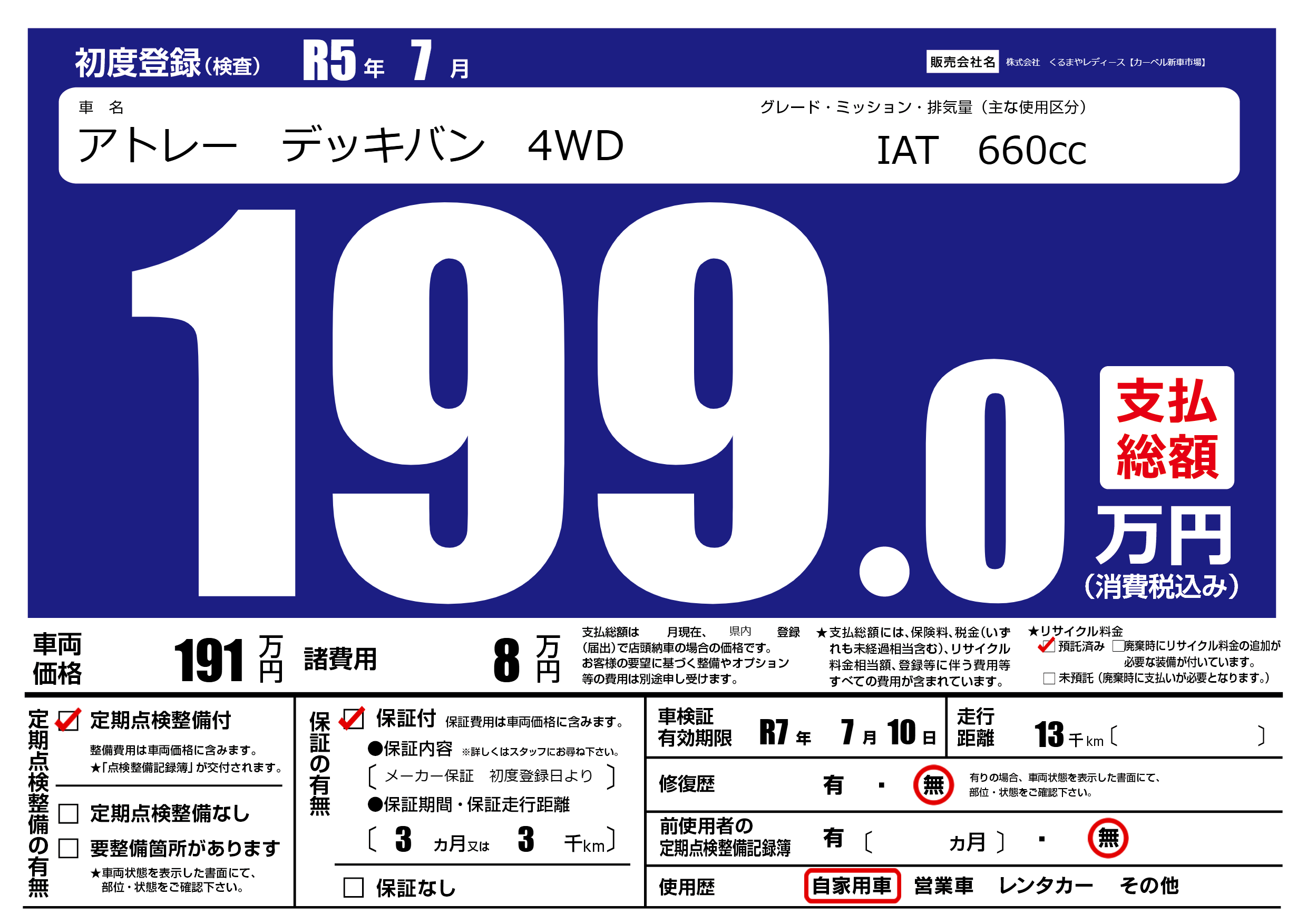 | 走行キロ | 1.3万km | 初年度登録 | R5年7月 |