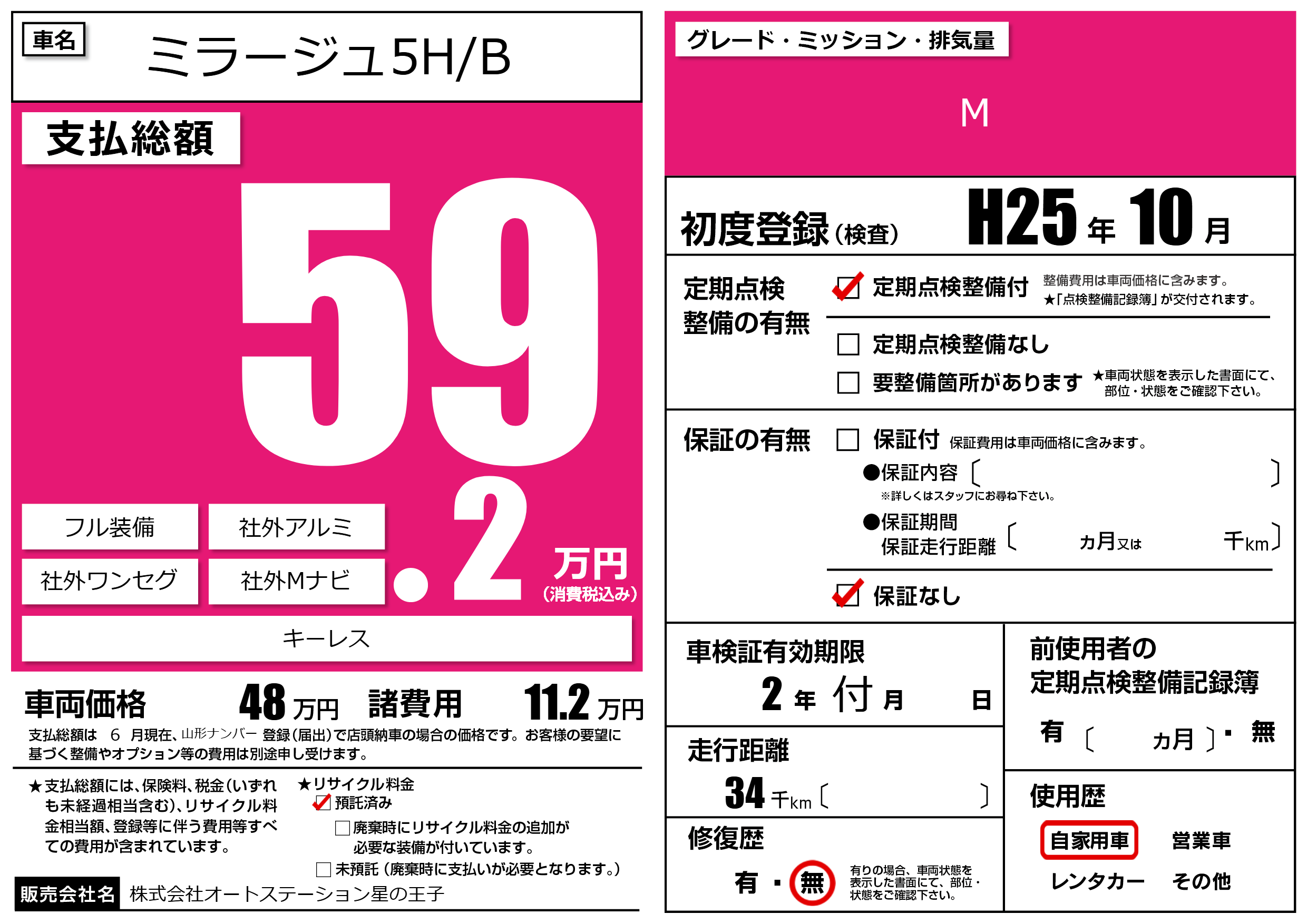 | 走行キロ | 3.4万km | 初年度登録 | H25年10月 |