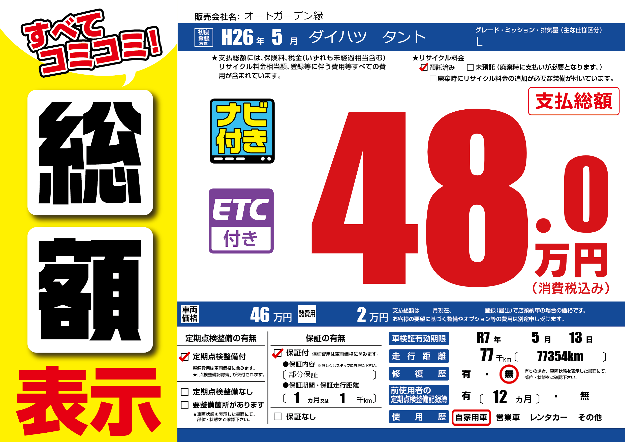| 車名 | ダイハツ タント | グレード ミッション 排気量 |