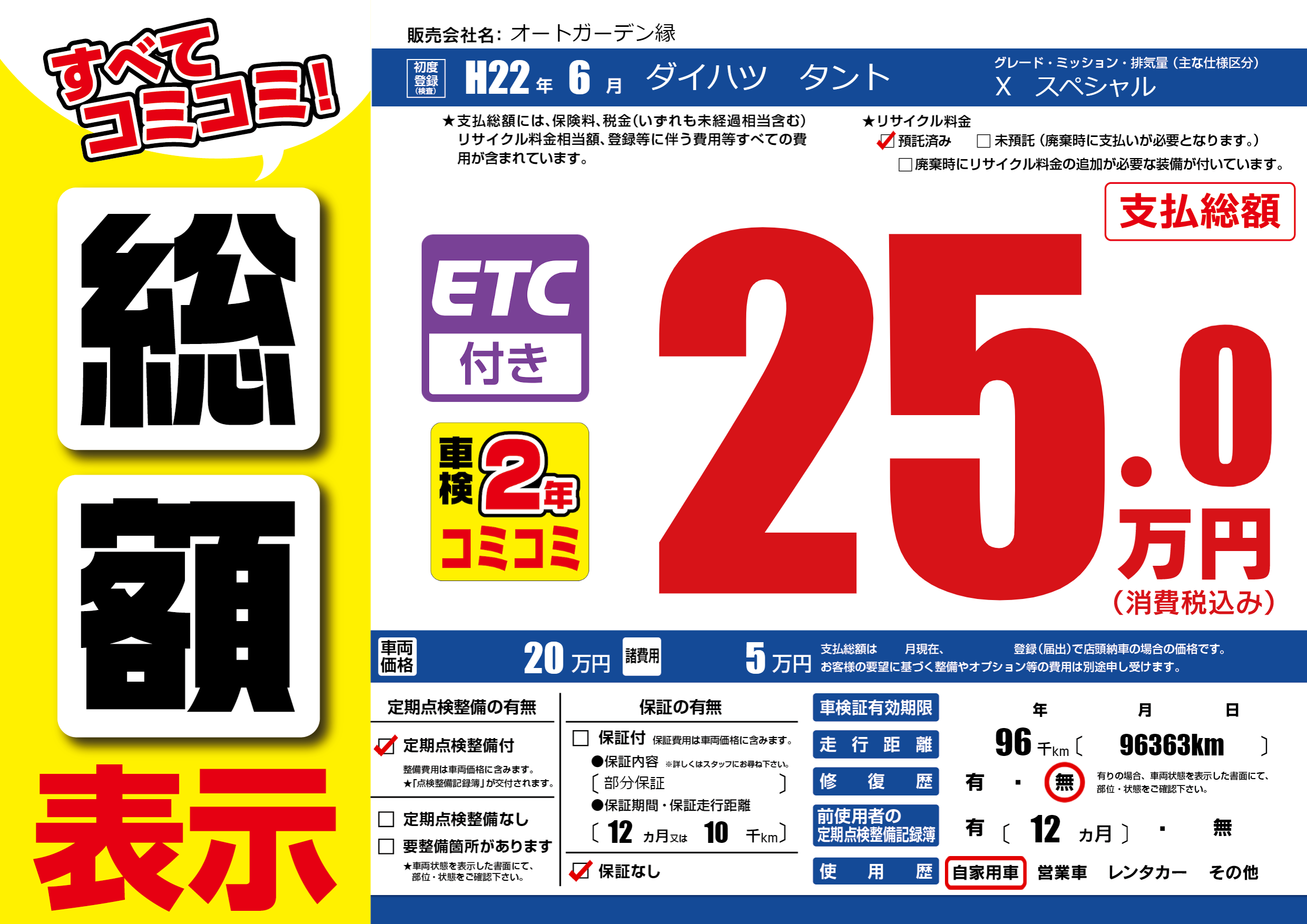 | 車名 | ダイハツ タント | グレード ミッション 排気量 |