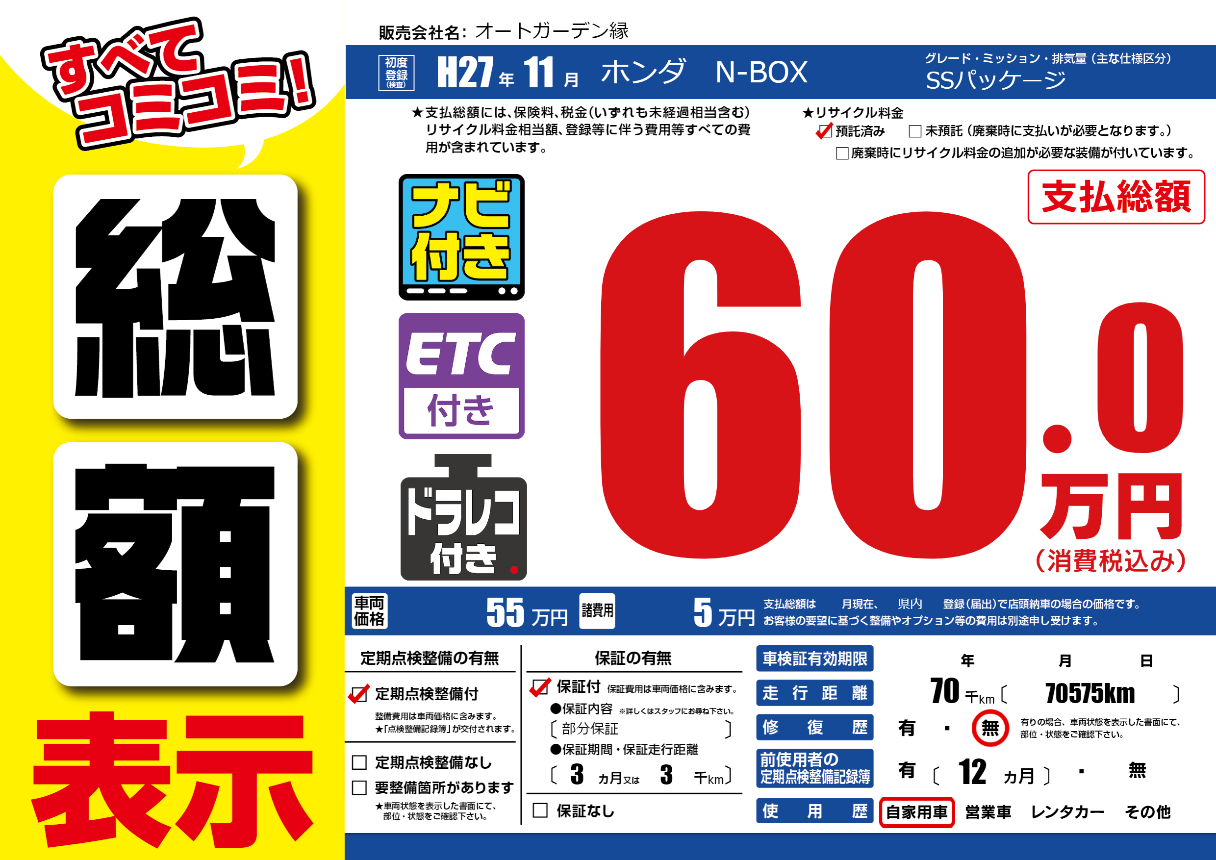 | 車名 | ホンダ N-BOX | グレード ミッション 排気量 |