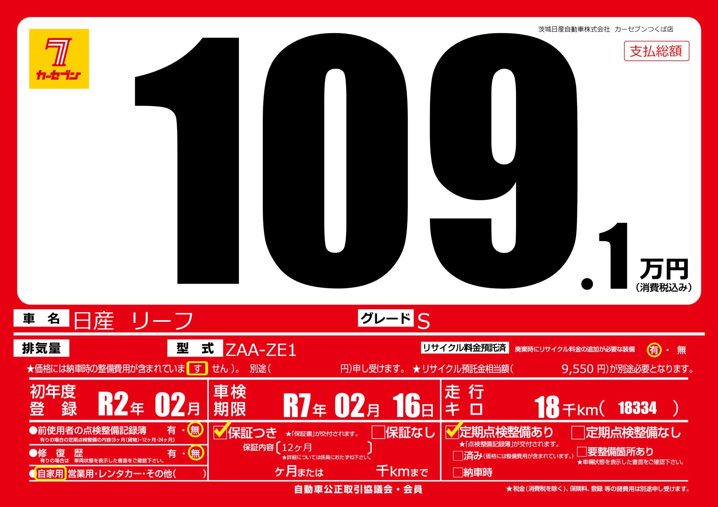 | 車名 | 日産 リーフ | グレード ミッション 排気量 |
