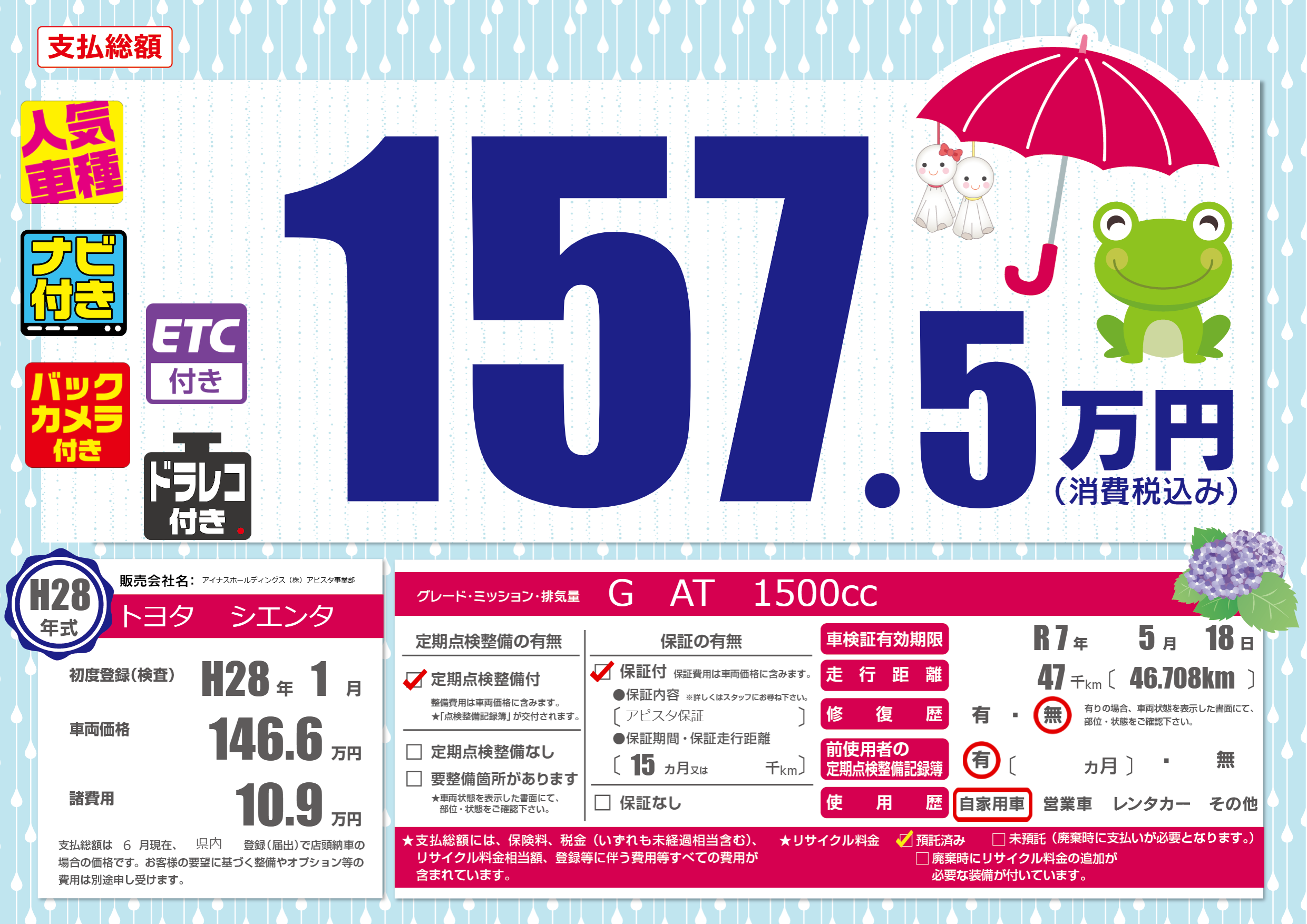 | 車名 | トヨタ シエンタ | グレード ミッション 排気量 |