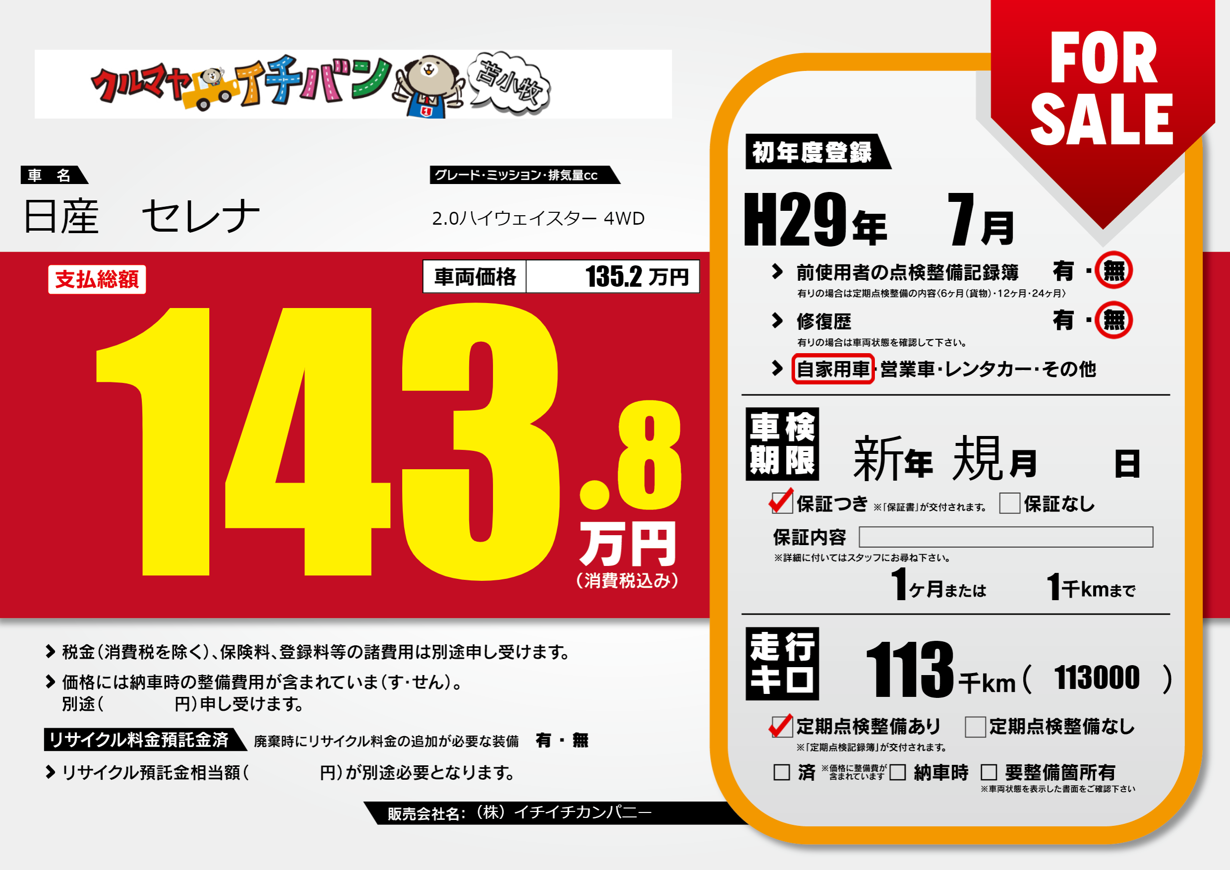 保証付き 保証内容(---) 1ヶ月または(1)千kmまで |