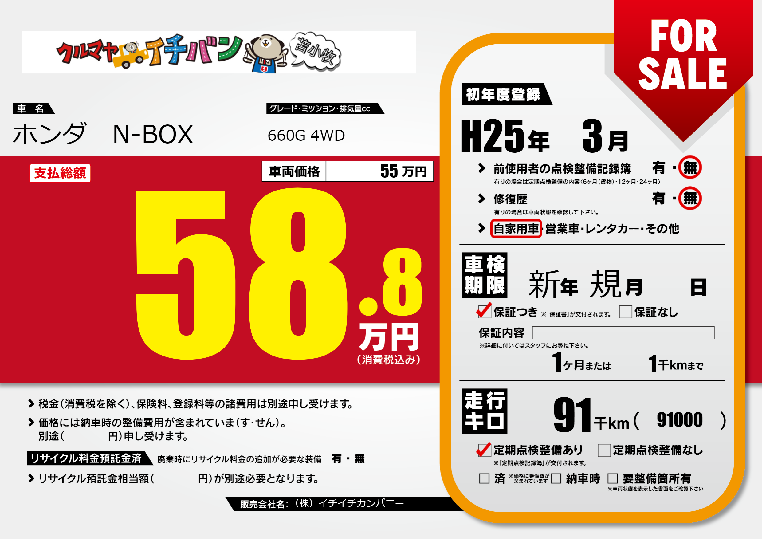 | 車名 | ホンダ N-BOX | グレード ミッション 排気量 |