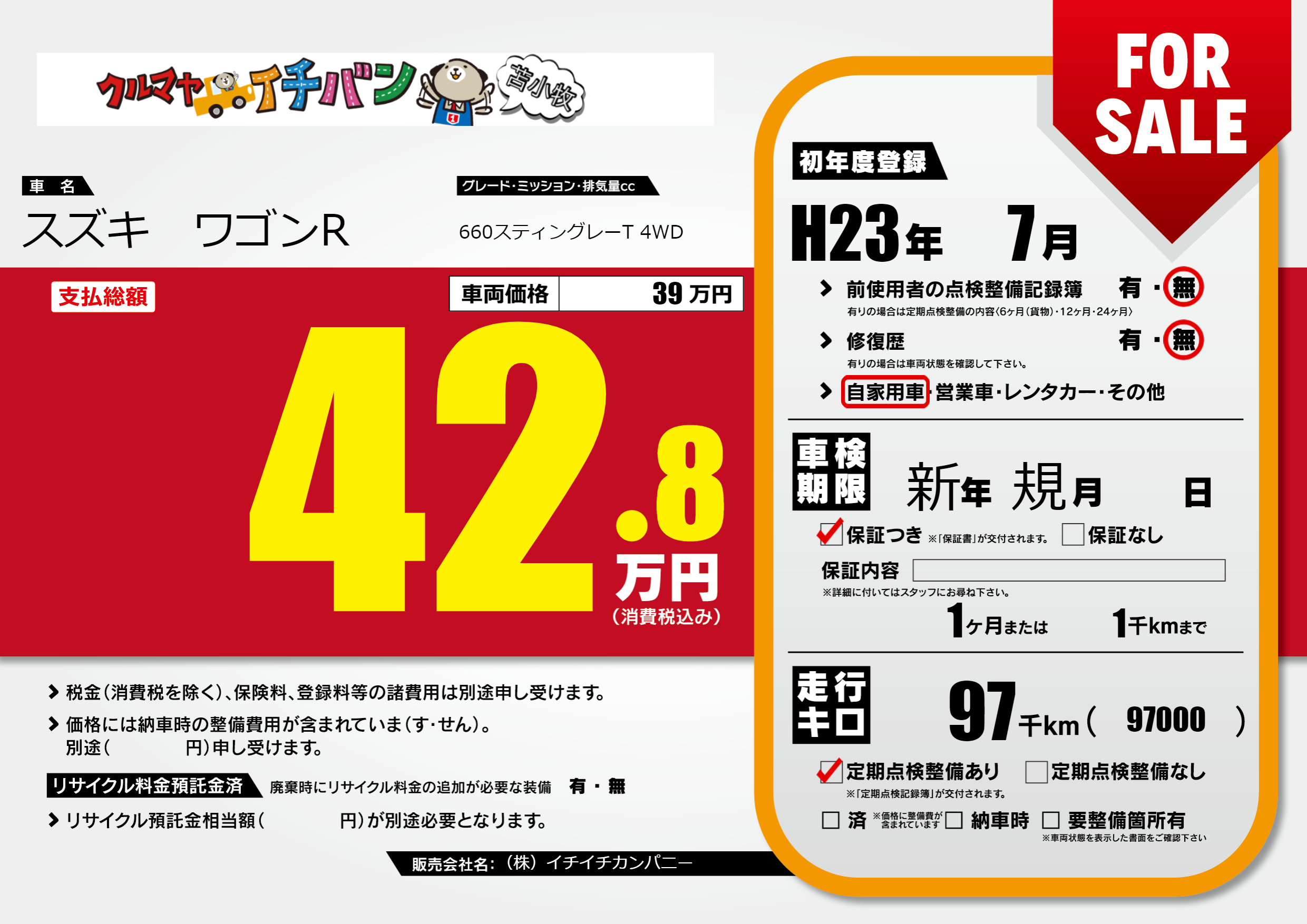 | 走行キロ | 9.7万km | 初年度登録 | H23年7月 |