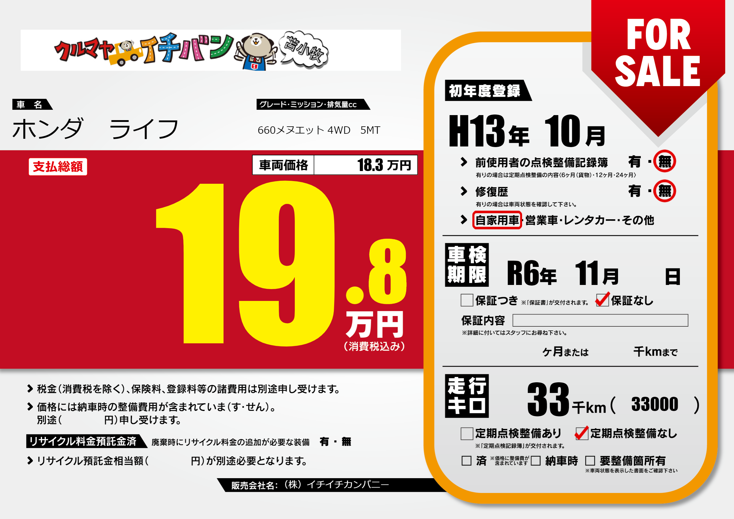 | 走行キロ | 3.3万km | 初年度登録 | H13年10月 |