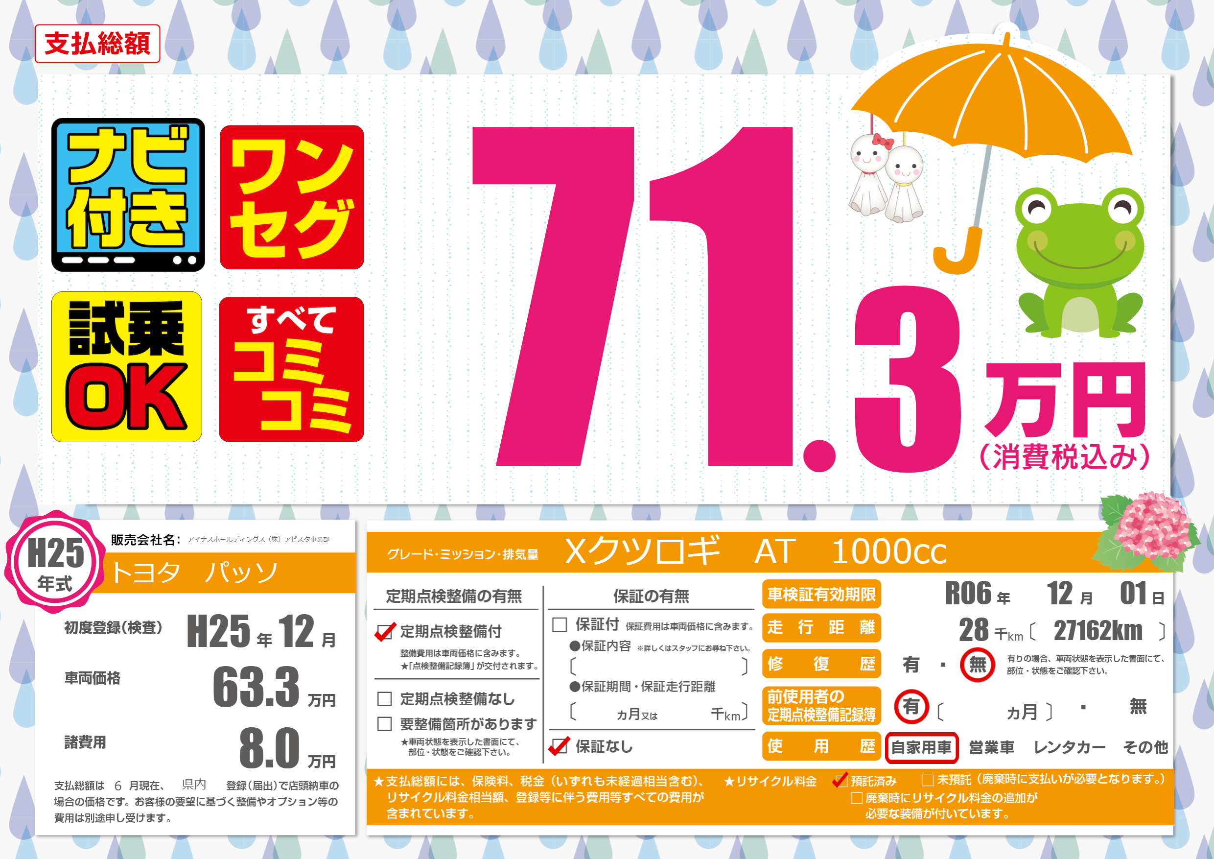 | 車名 | トヨタ パッソ | グレード ミッション 排気量 |